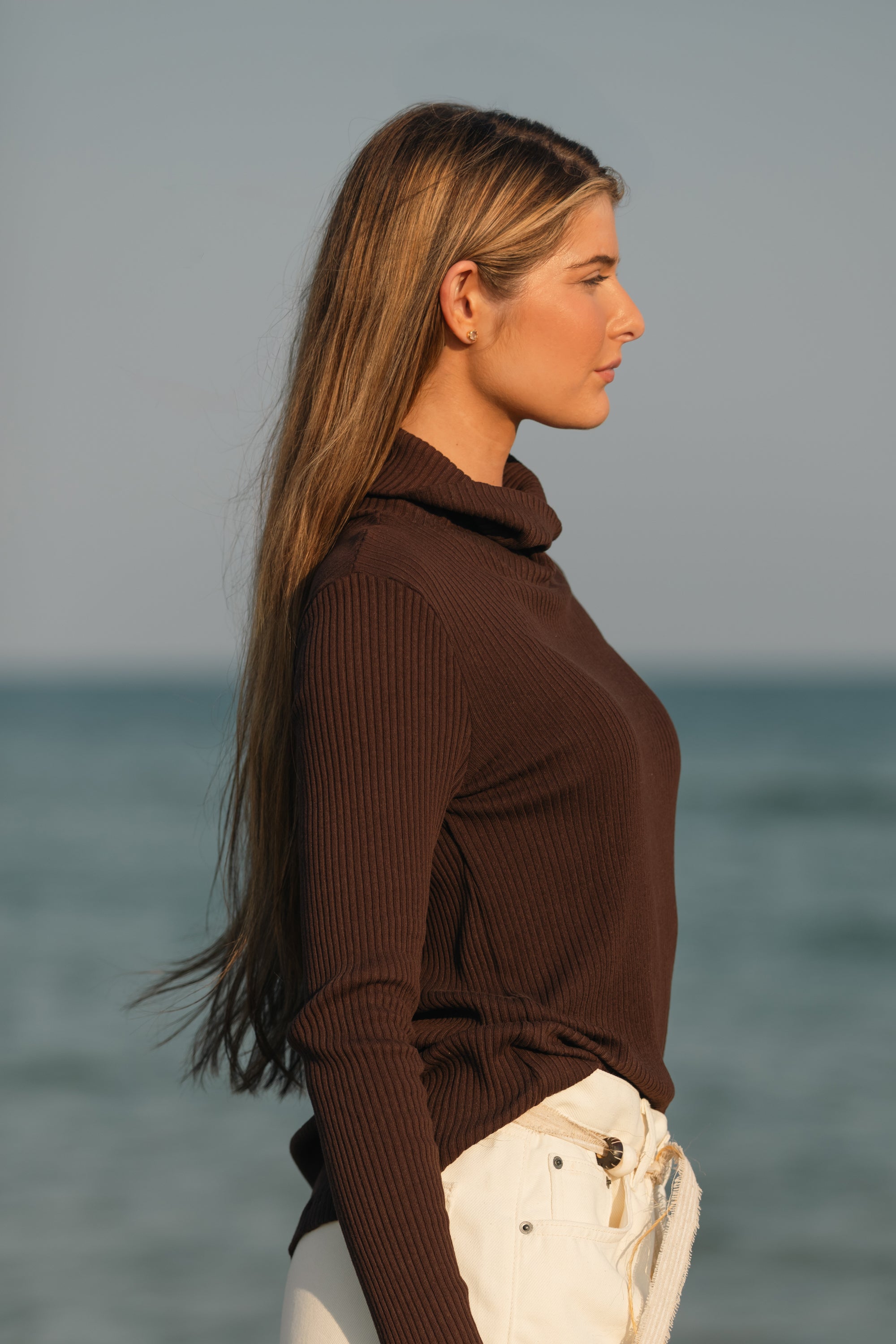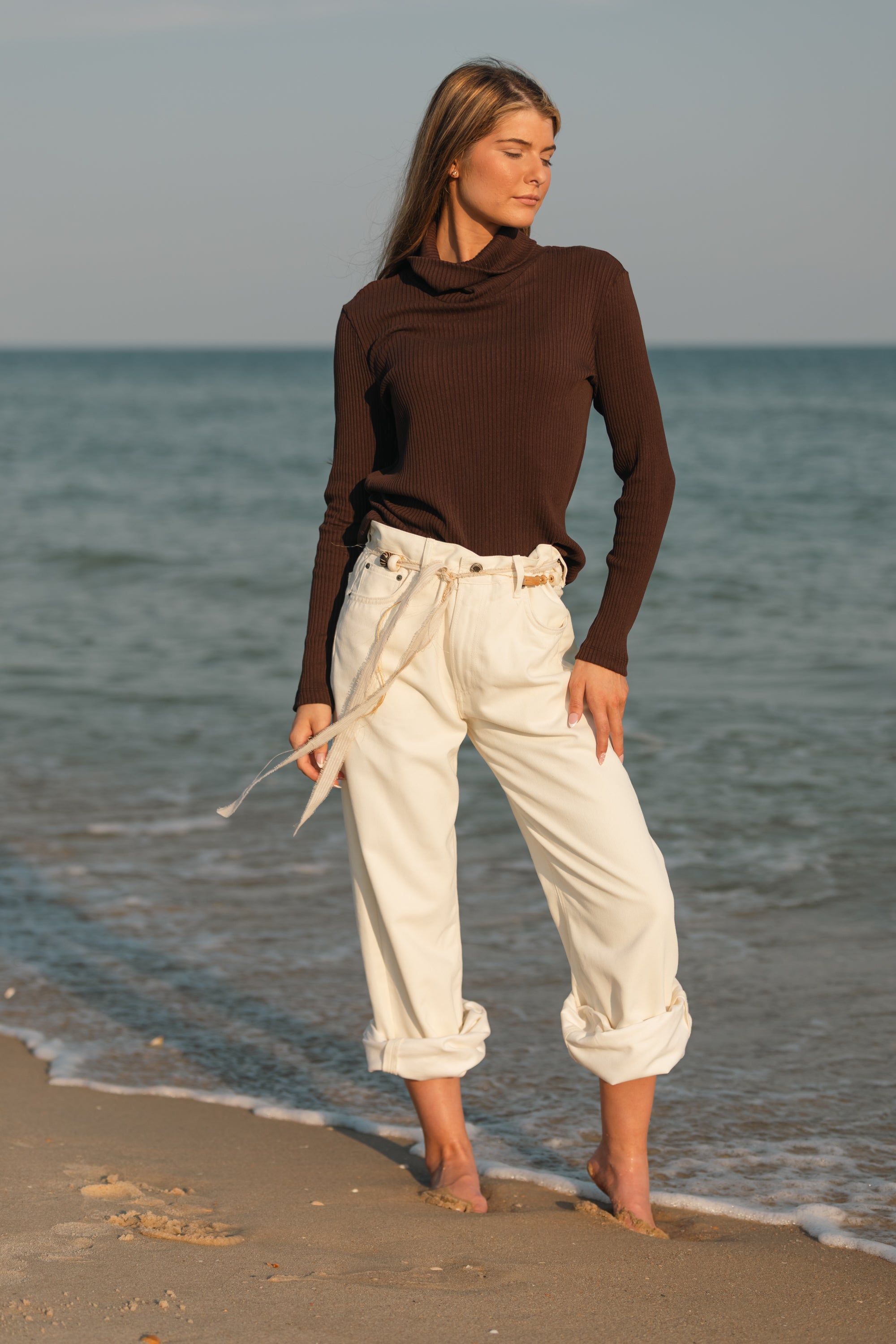 The Bonfire Sweater is built for easy layering on cooler days. Made of ribbed cotton fabric and a clean silhouette, it’s both functional and refined. The turtleneck offers two looks—folded down or worn tall—while the fitted sleeves finish neatly at the wrist.