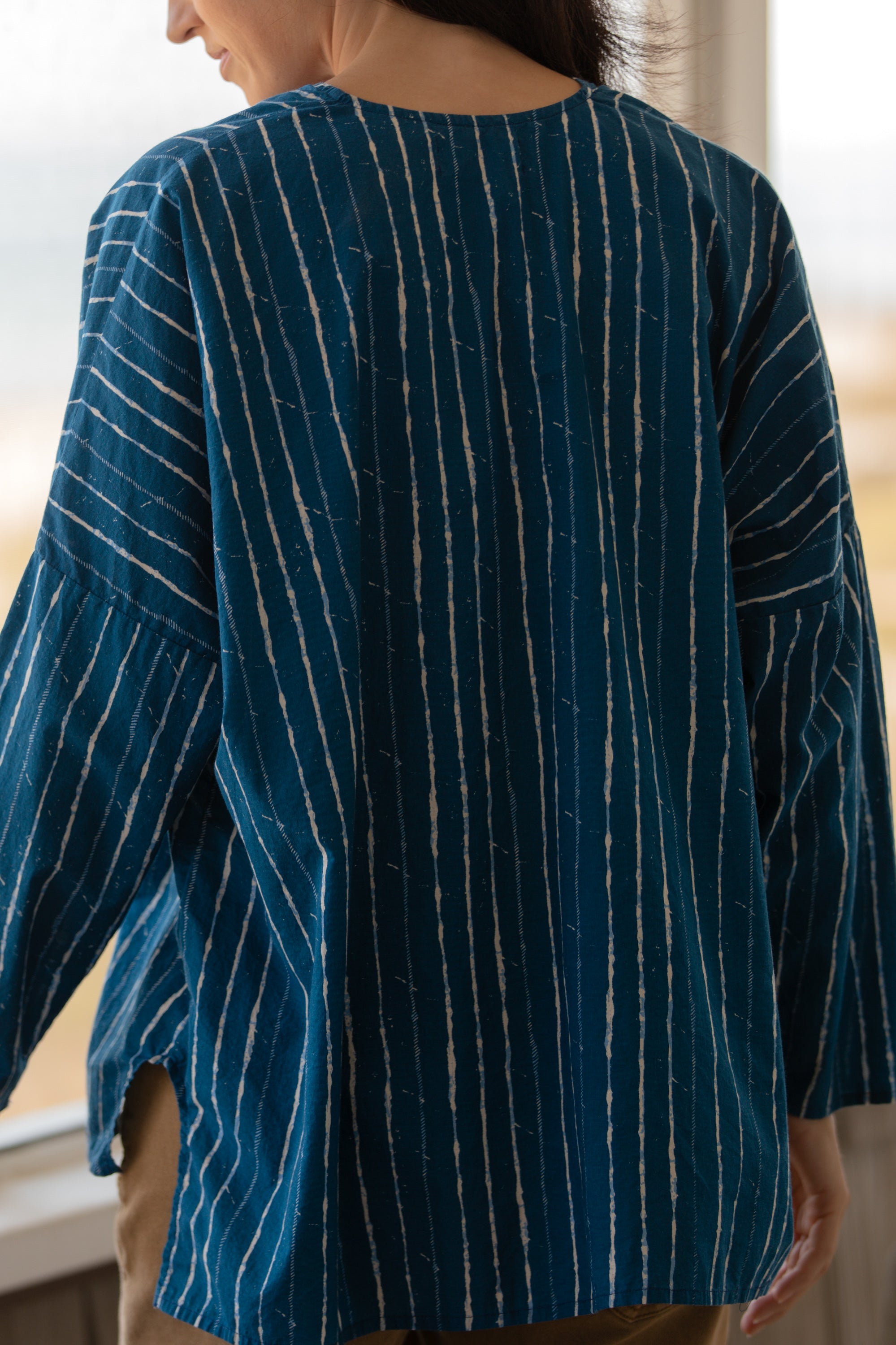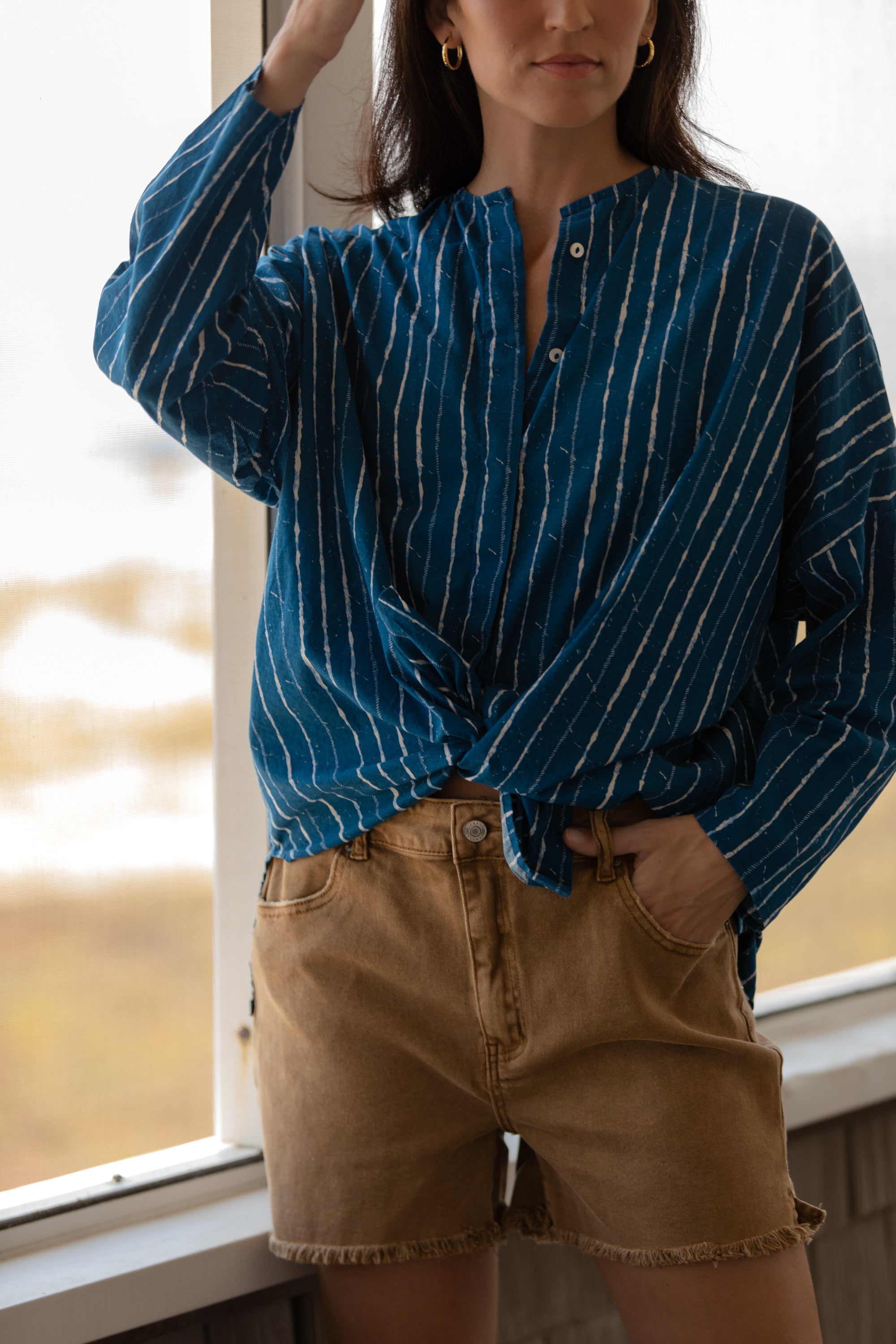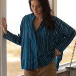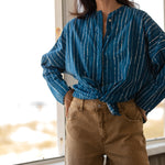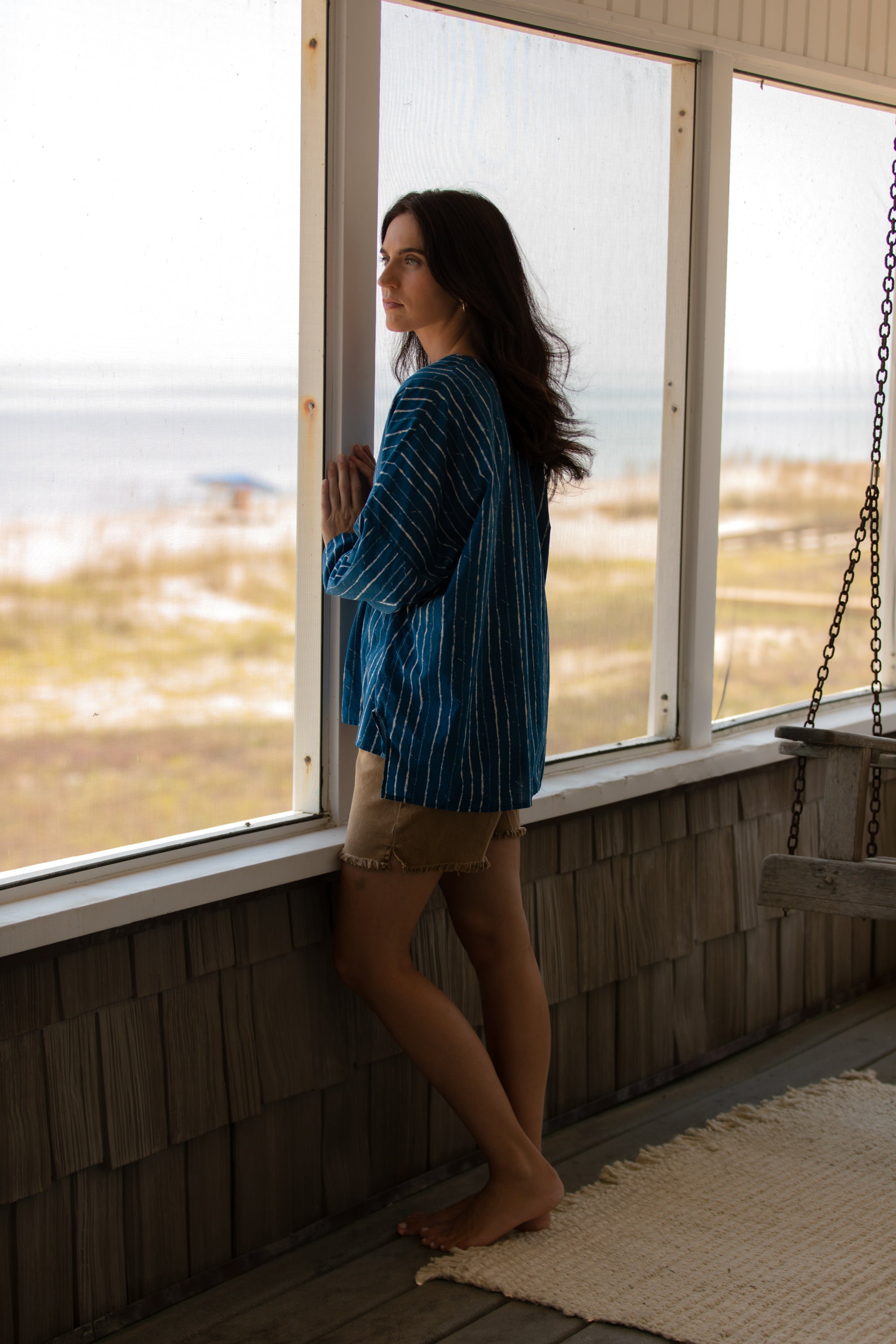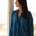 The Cotton Sunset Shirt is a versatile piece perfect for any season, featuring a voluminous silhouette that pairs effortlessly with jeans, shorts, or as an open cardigan over a midi top. The extra-long sleeves can be rolled up for a stylish yet comfortable look.