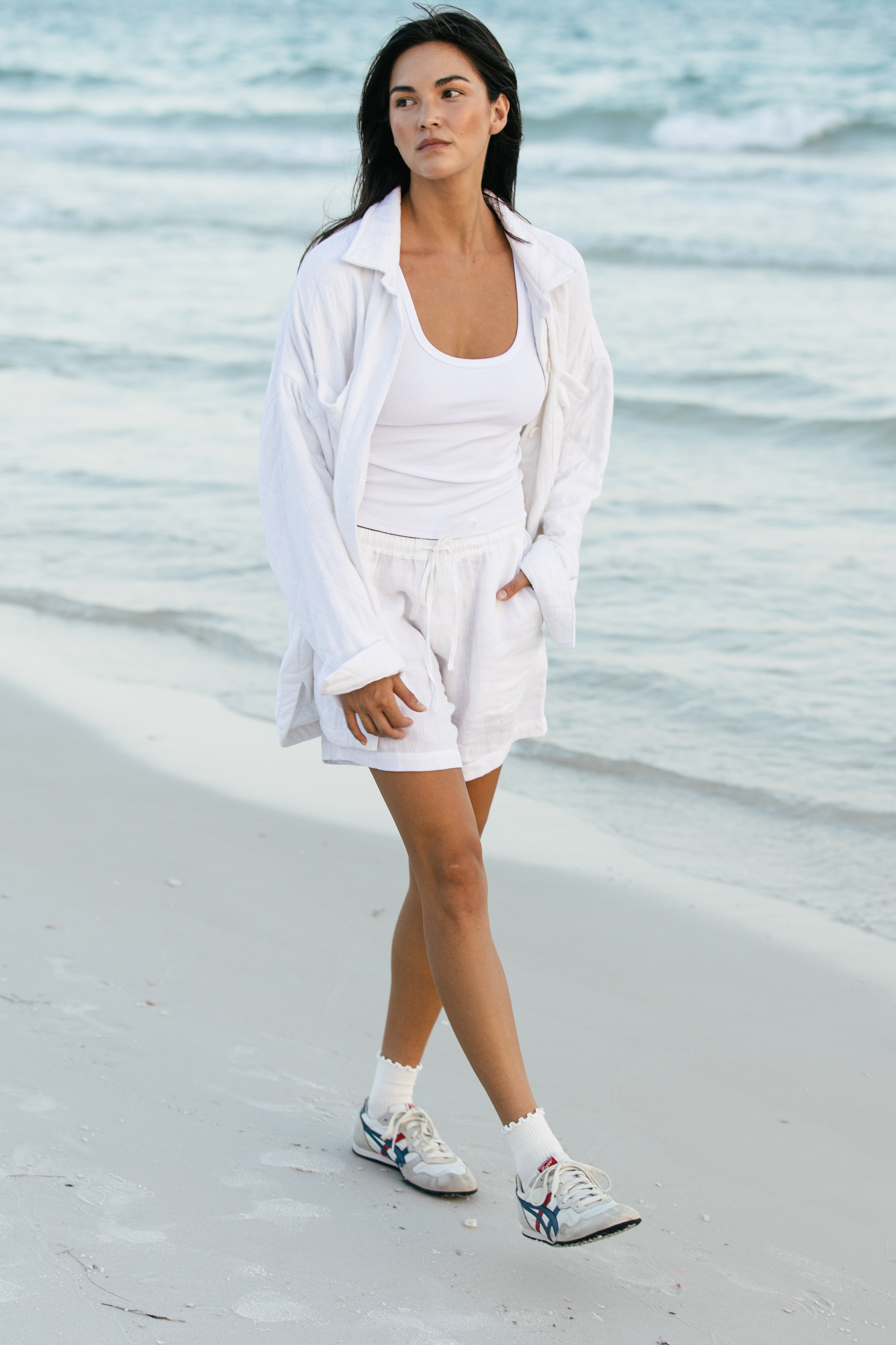 The Cozy Cotton Jacket is made from buttery soft cotton, washed for a perfectly worn-in feel. The gauze fabric ensures comfort and breathability, keeping you cozy without overheating. It layers effortlessly over neutrals for a chic look. Featuring a quilted diamond stitch and elegant Mother of Pearl shell buttons, this jacket is made from the softest 100% cotton. It includes two front pockets and a curved hemline for added ease.