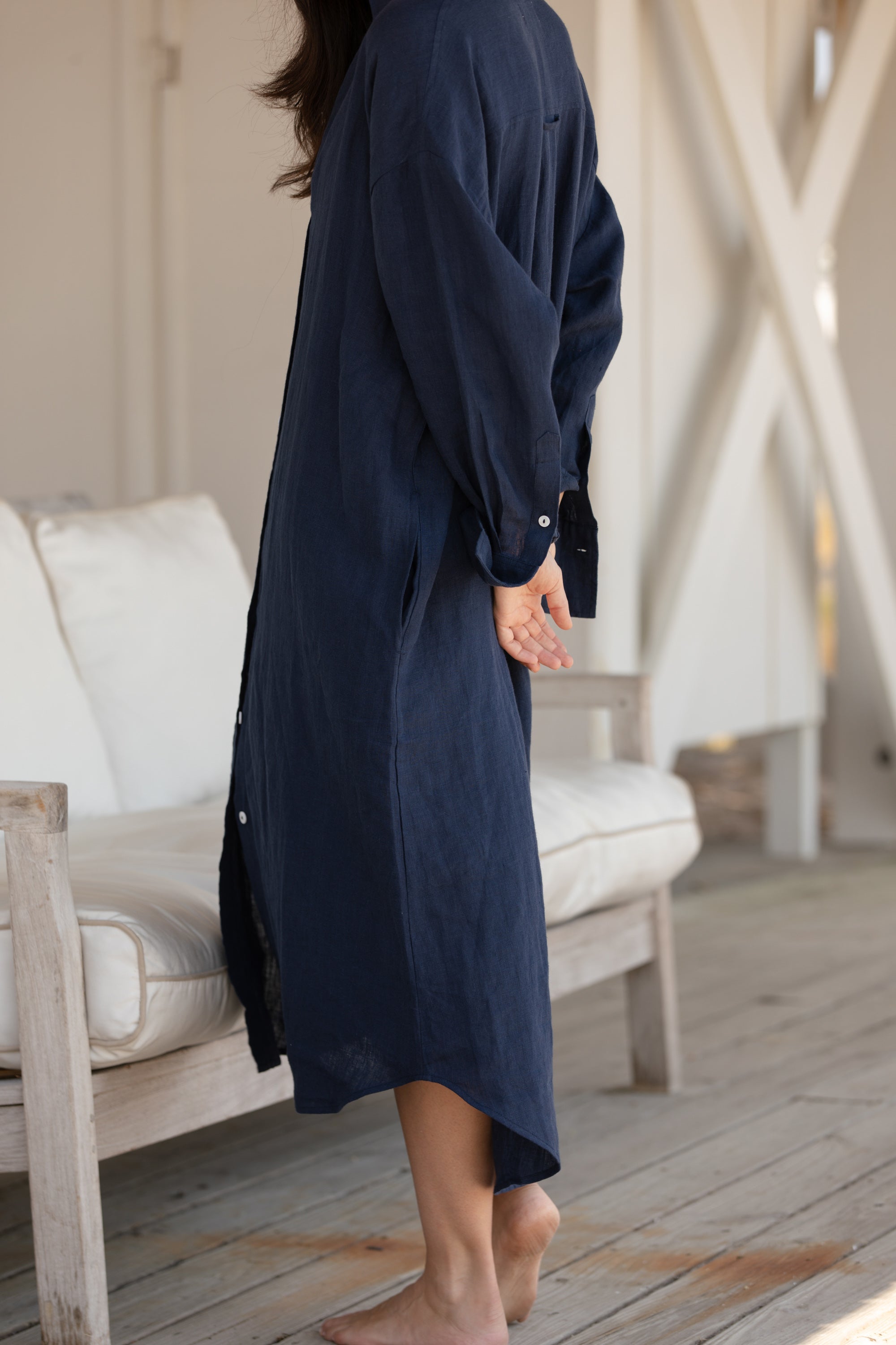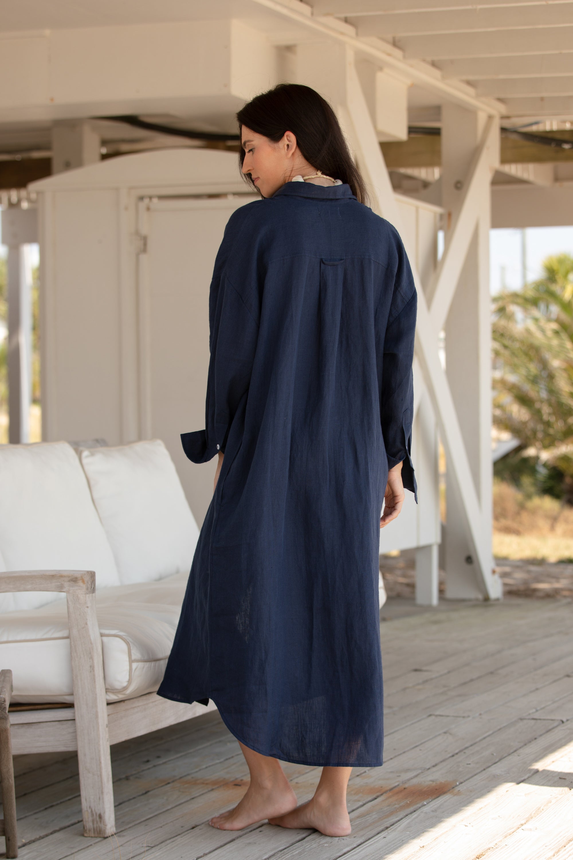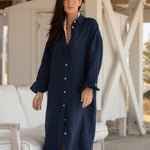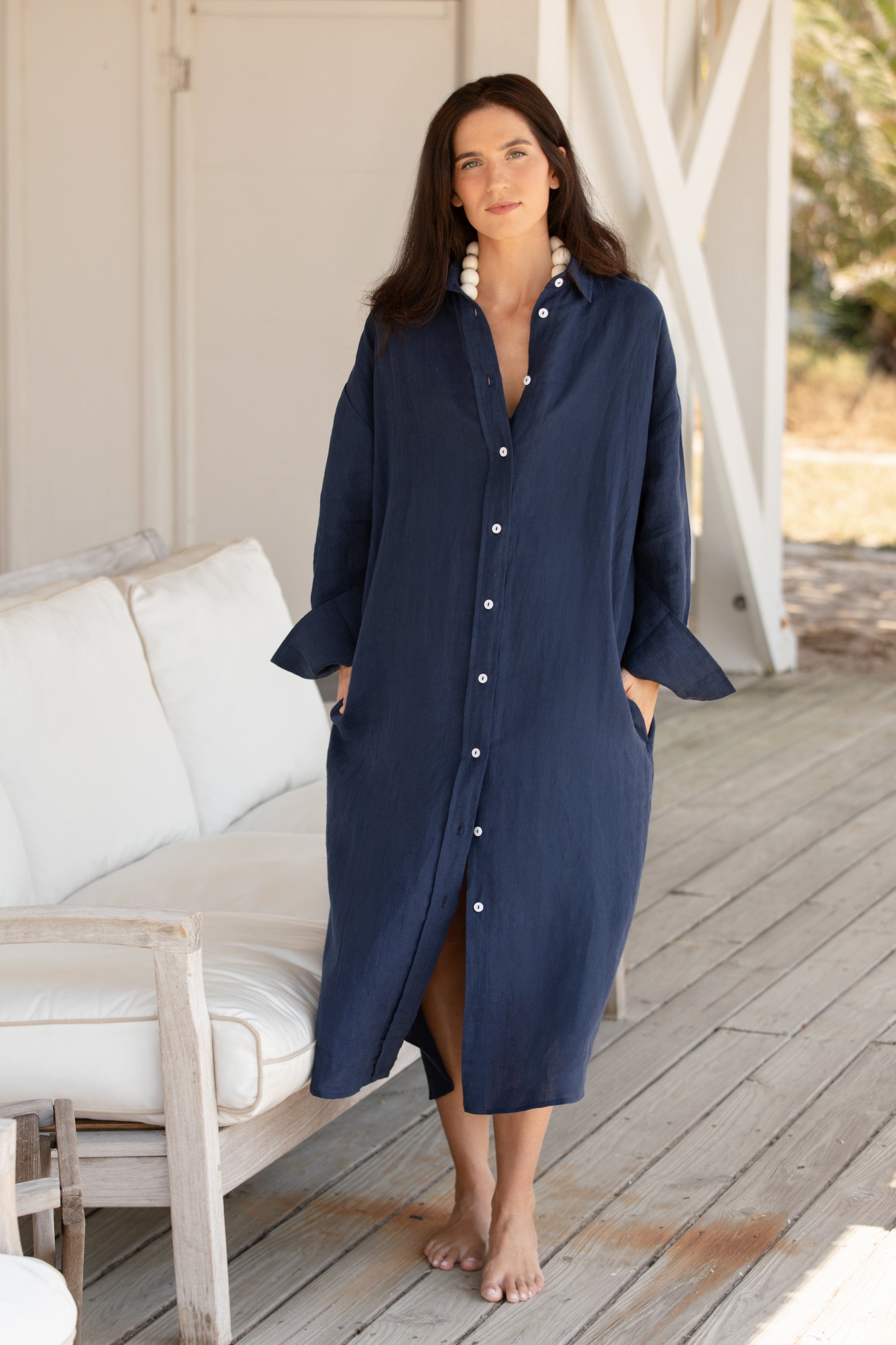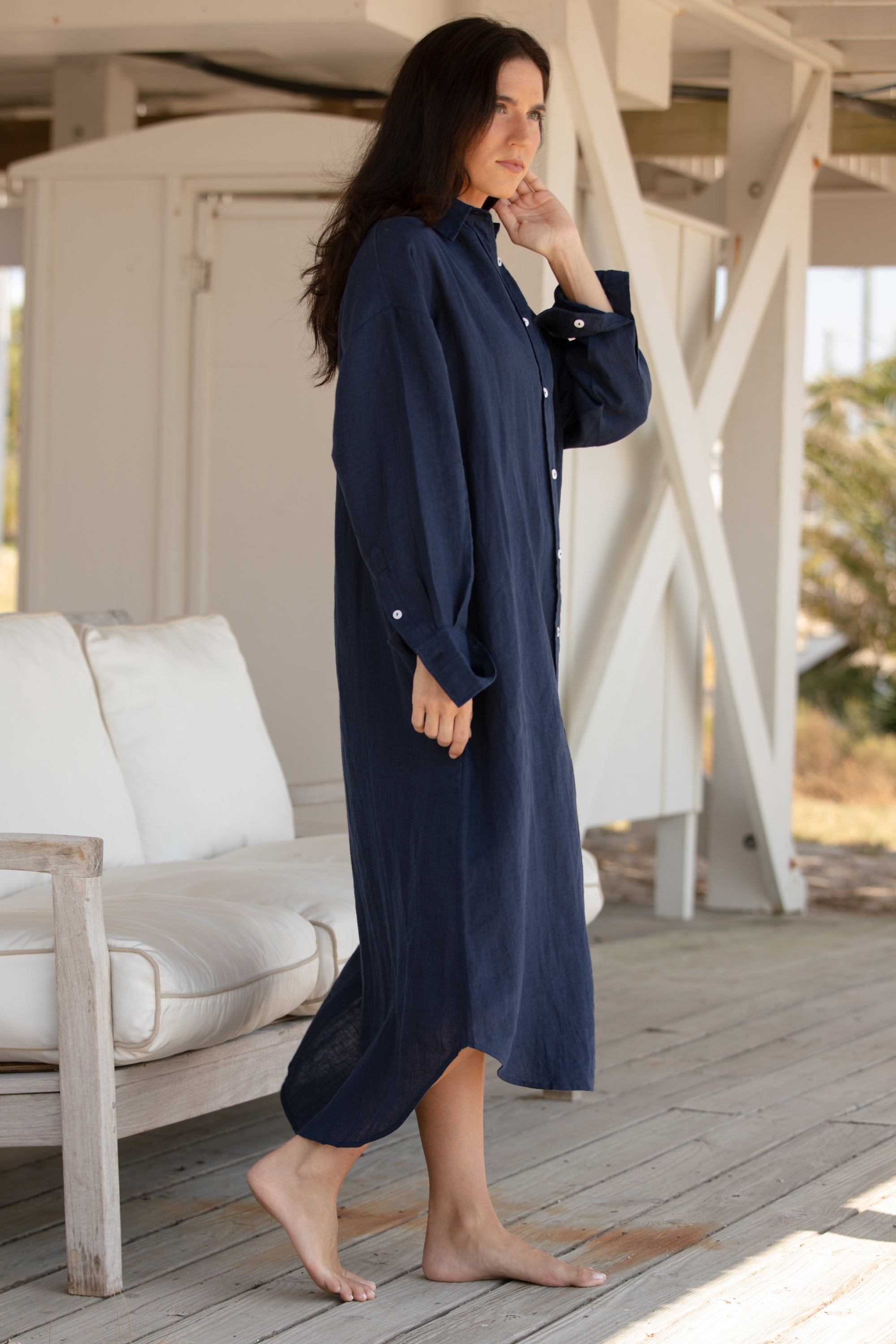 The Easygoing Linen Maxi Dress takes the much-loved silhouette of our Easygoing Shirt and reimagines it in a relaxed maxi dress style. Designed with the same classic collar, button front, and tuxedo-style cuffs, it offers an effortless balance of comfort and polish. This maxi dress is versatile enough to wear solo or layered for year-round styling.