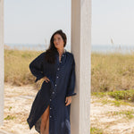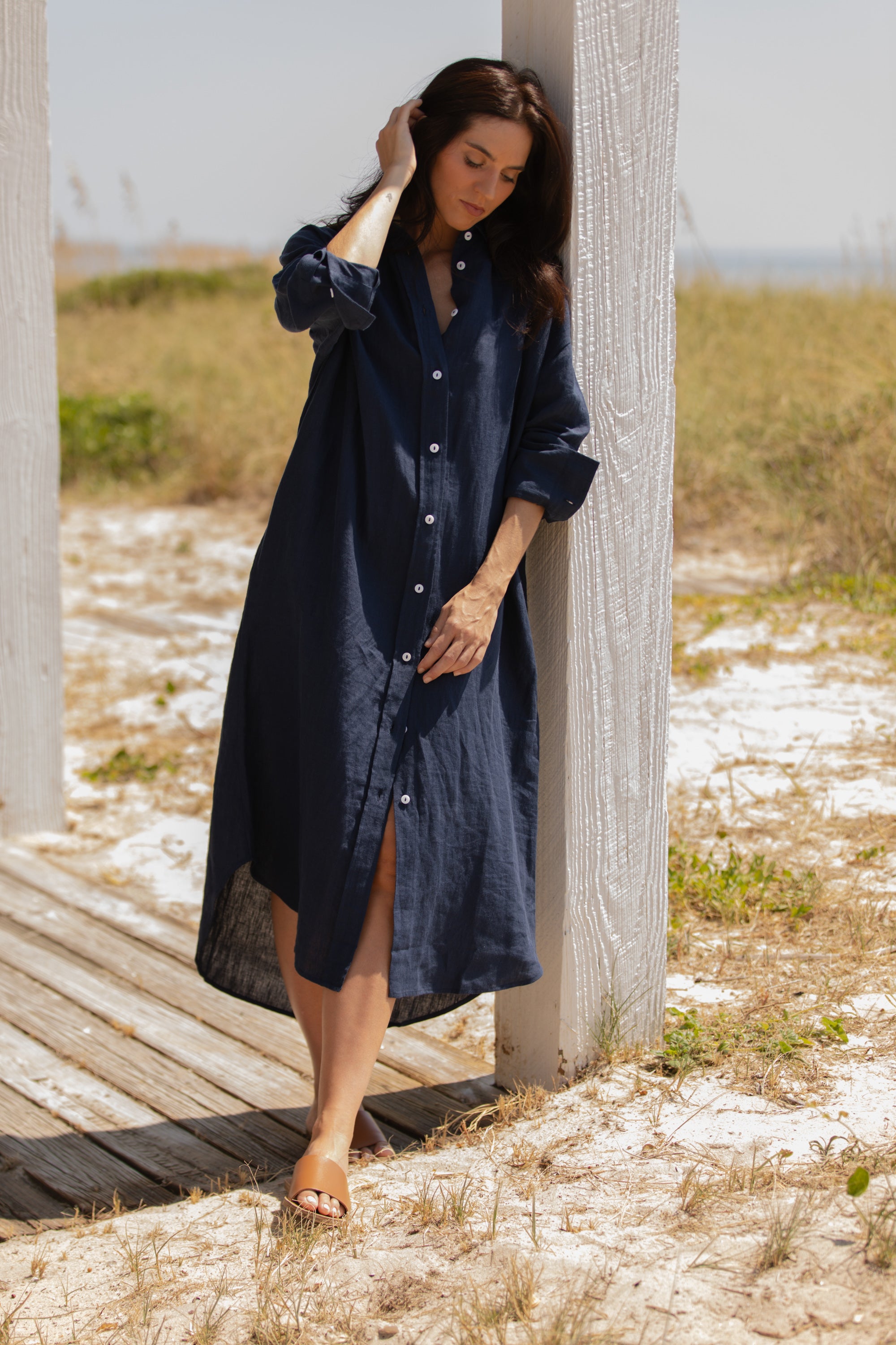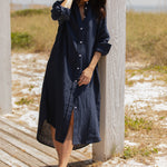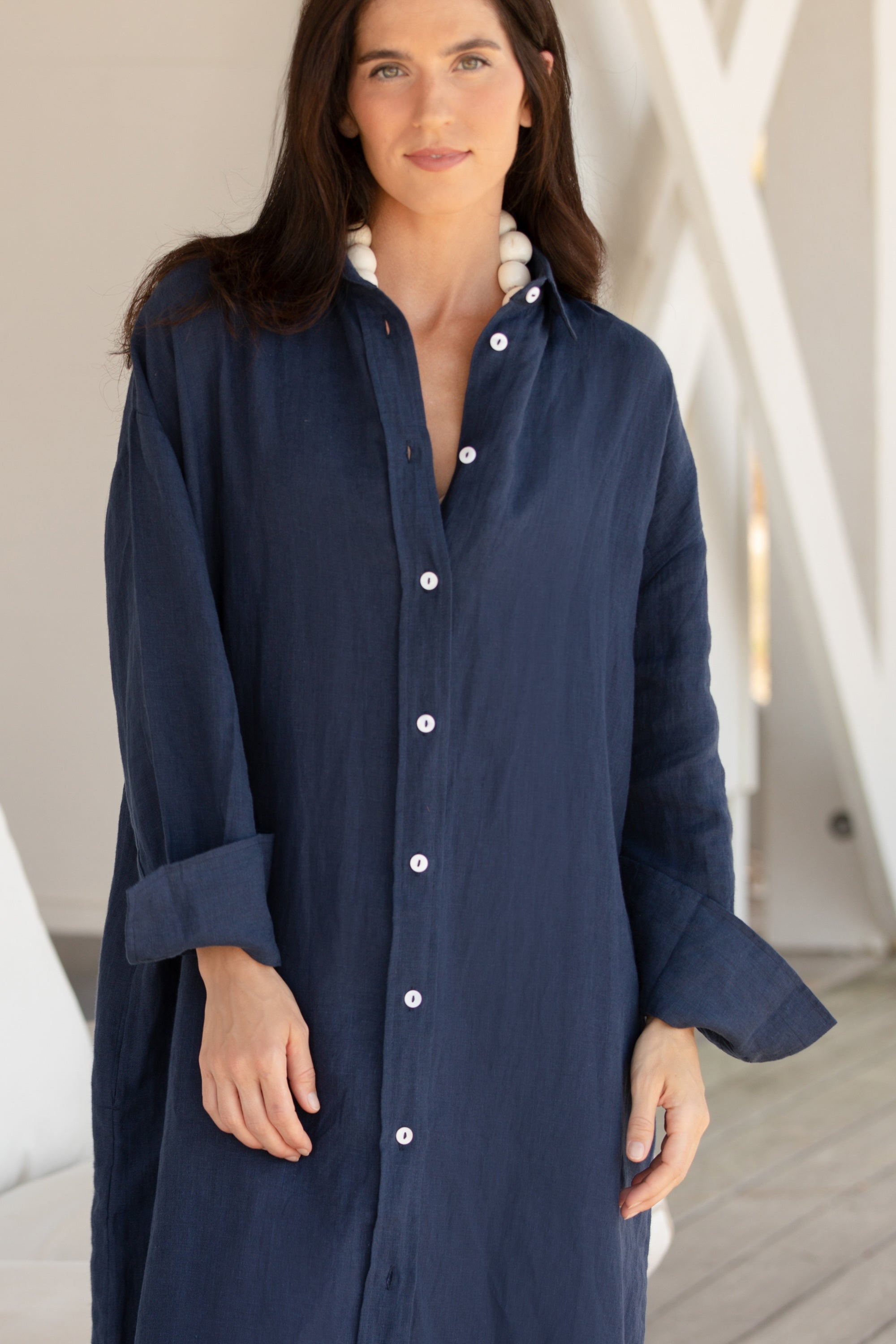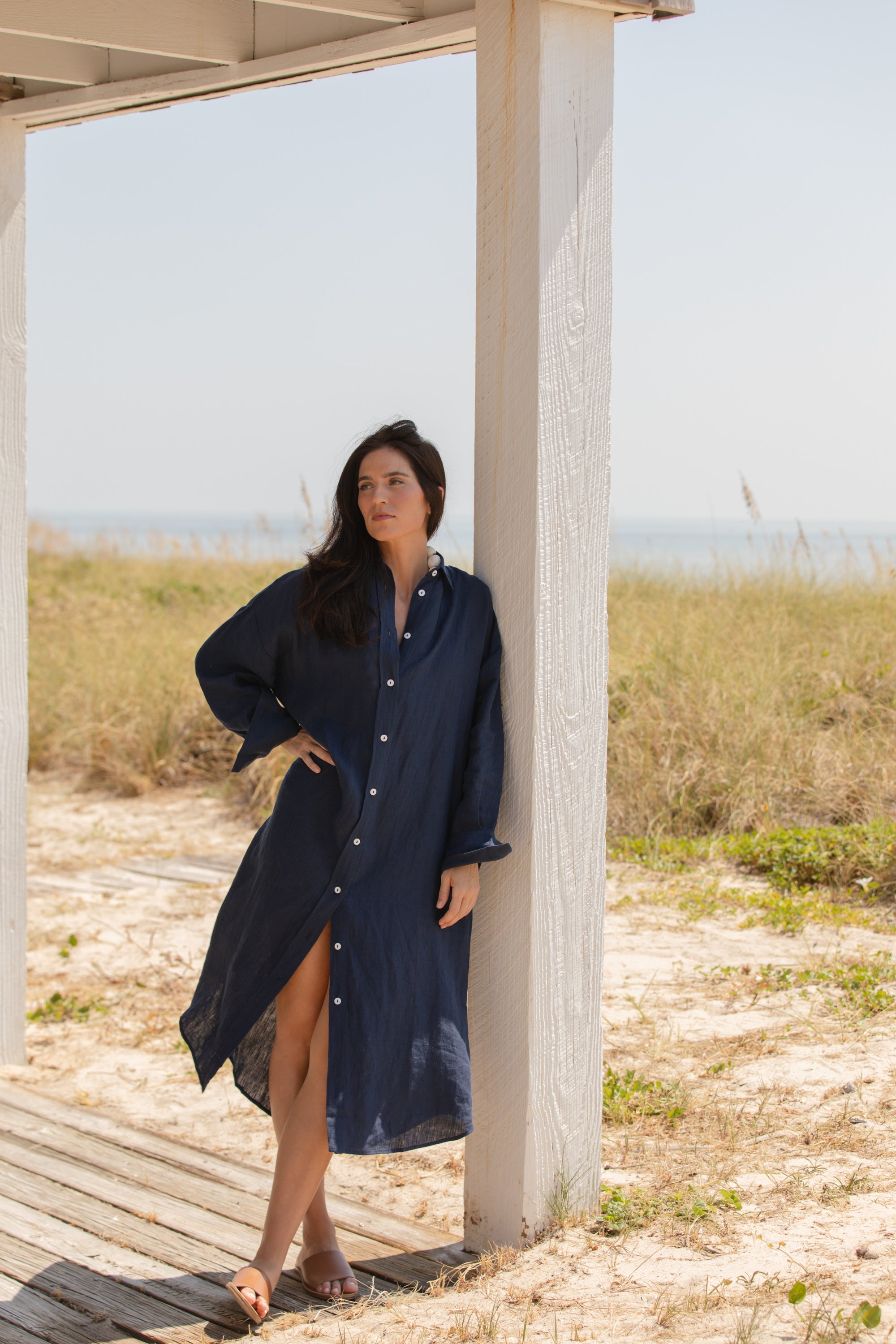 The Easygoing Linen Maxi Dress takes the much-loved silhouette of our Easygoing Shirt and reimagines it in a relaxed maxi dress style. Designed with the same classic collar, button front, and tuxedo-style cuffs, it offers an effortless balance of comfort and polish. This maxi dress is versatile enough to wear solo or layered for year-round styling.
