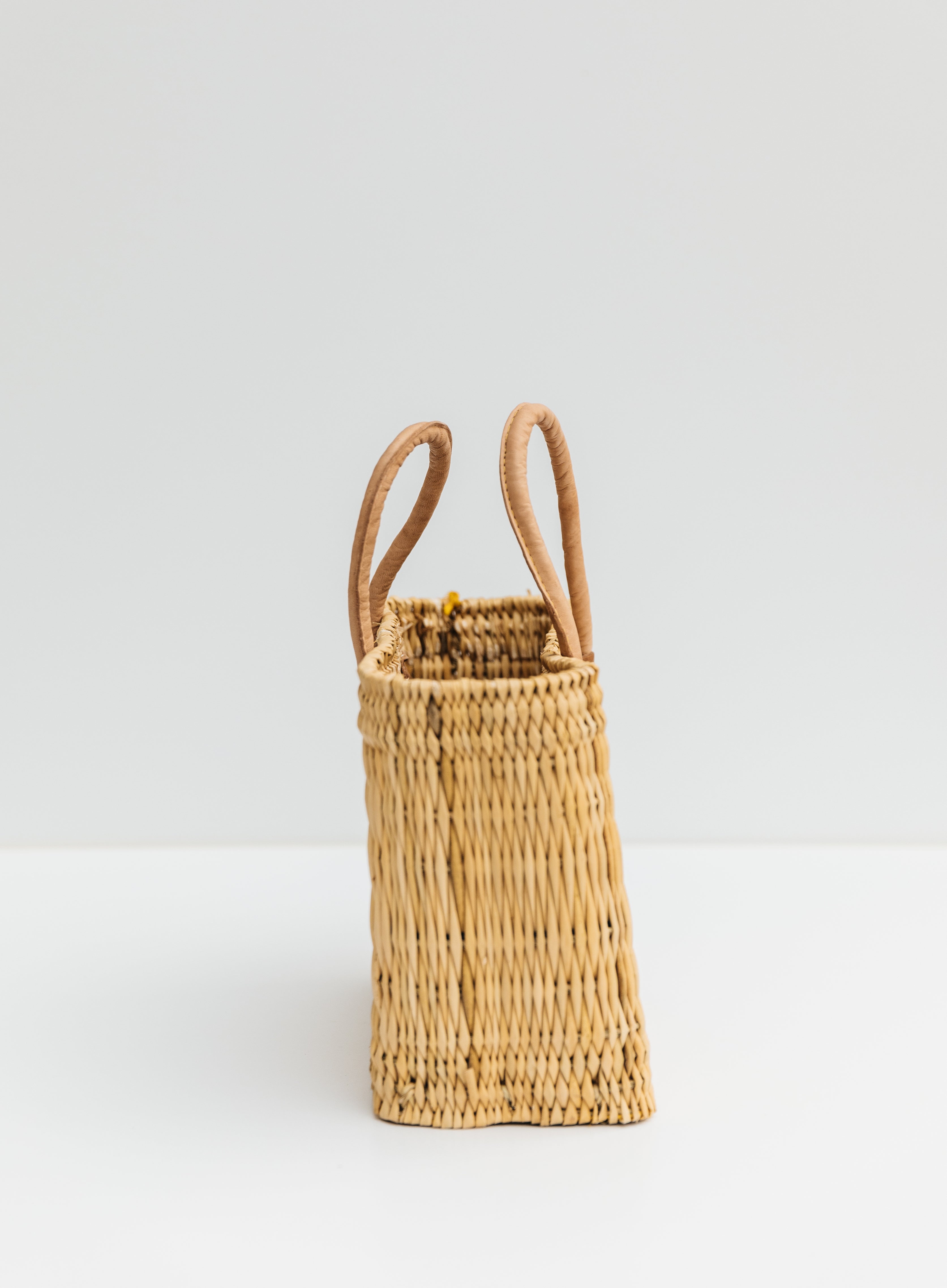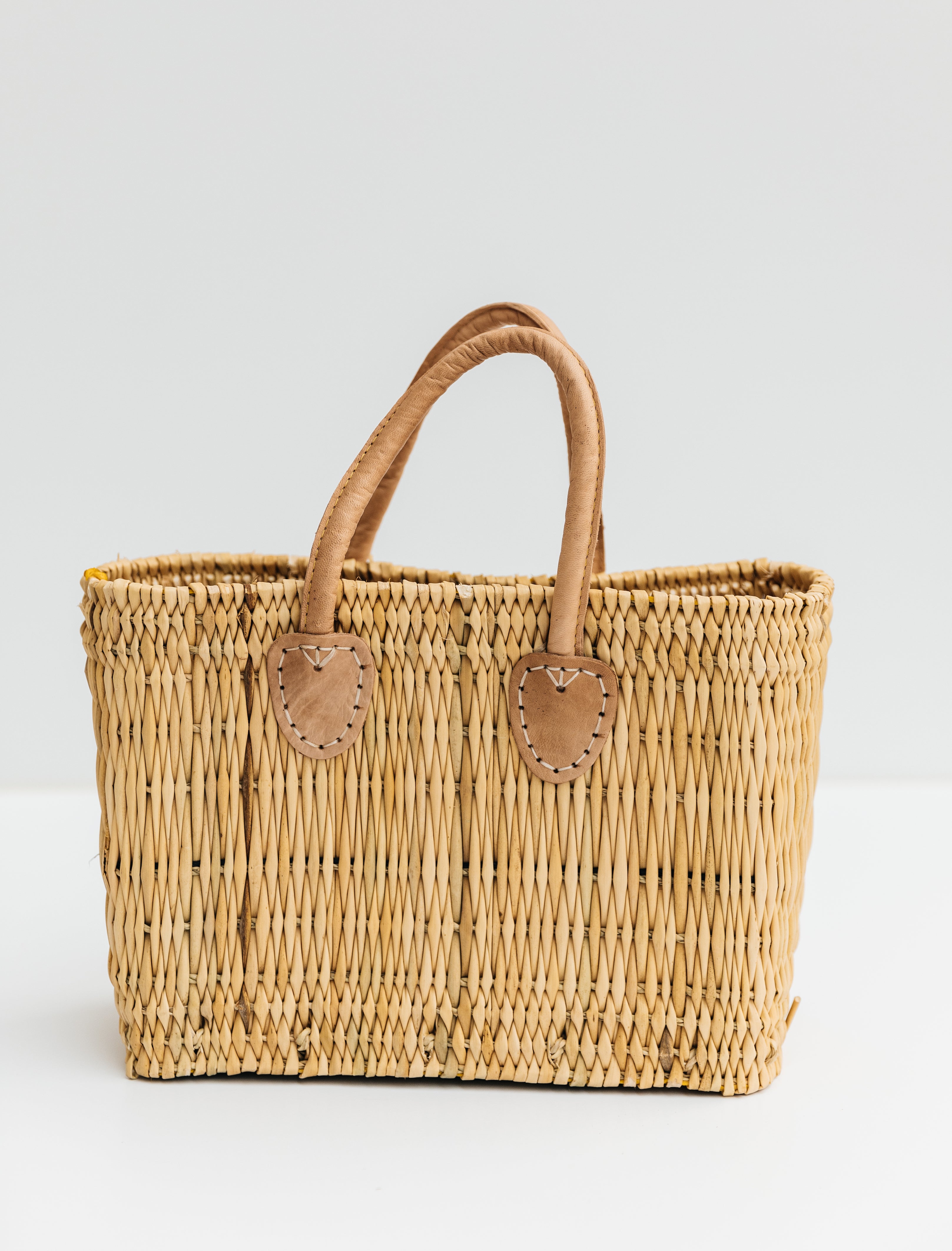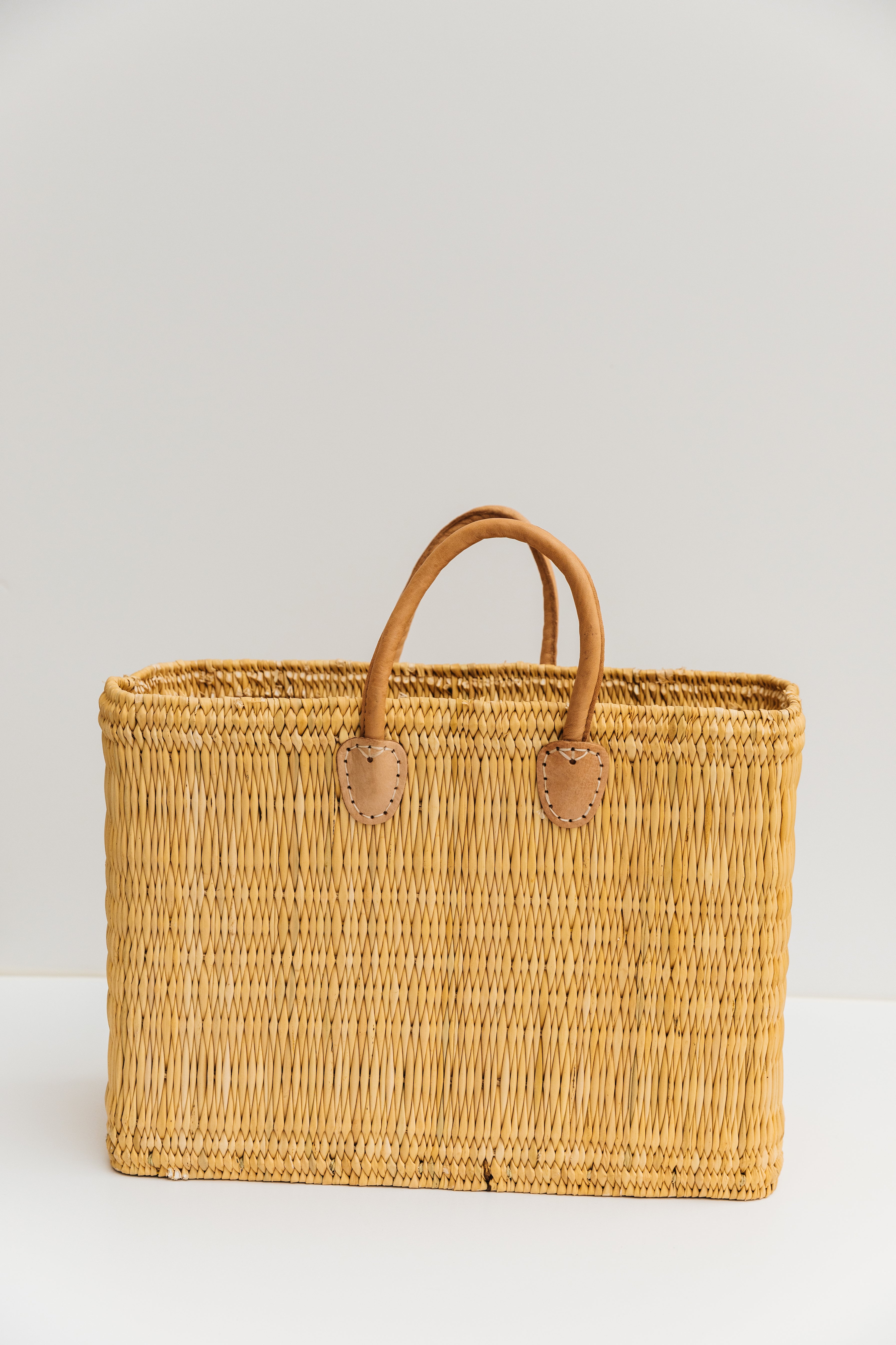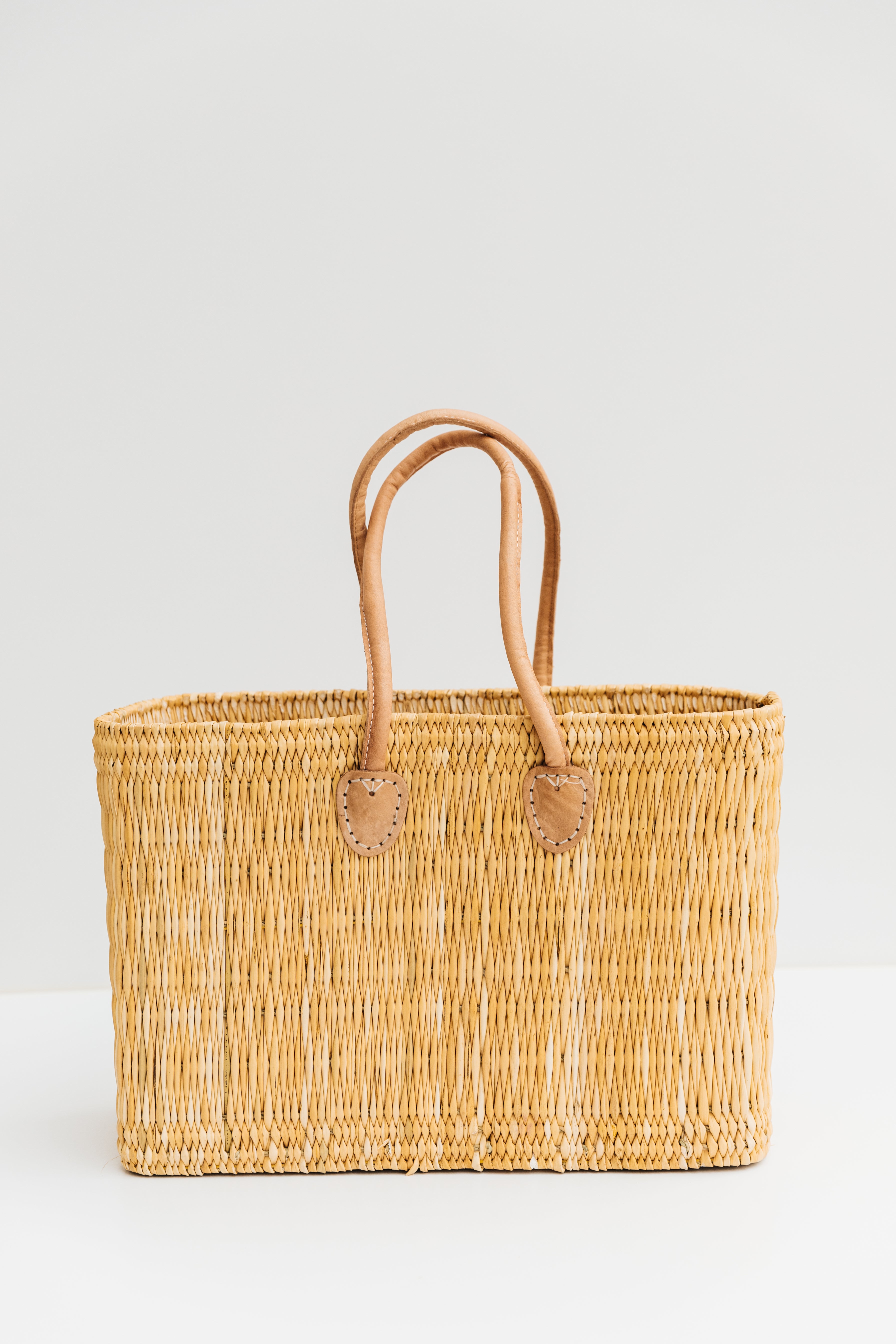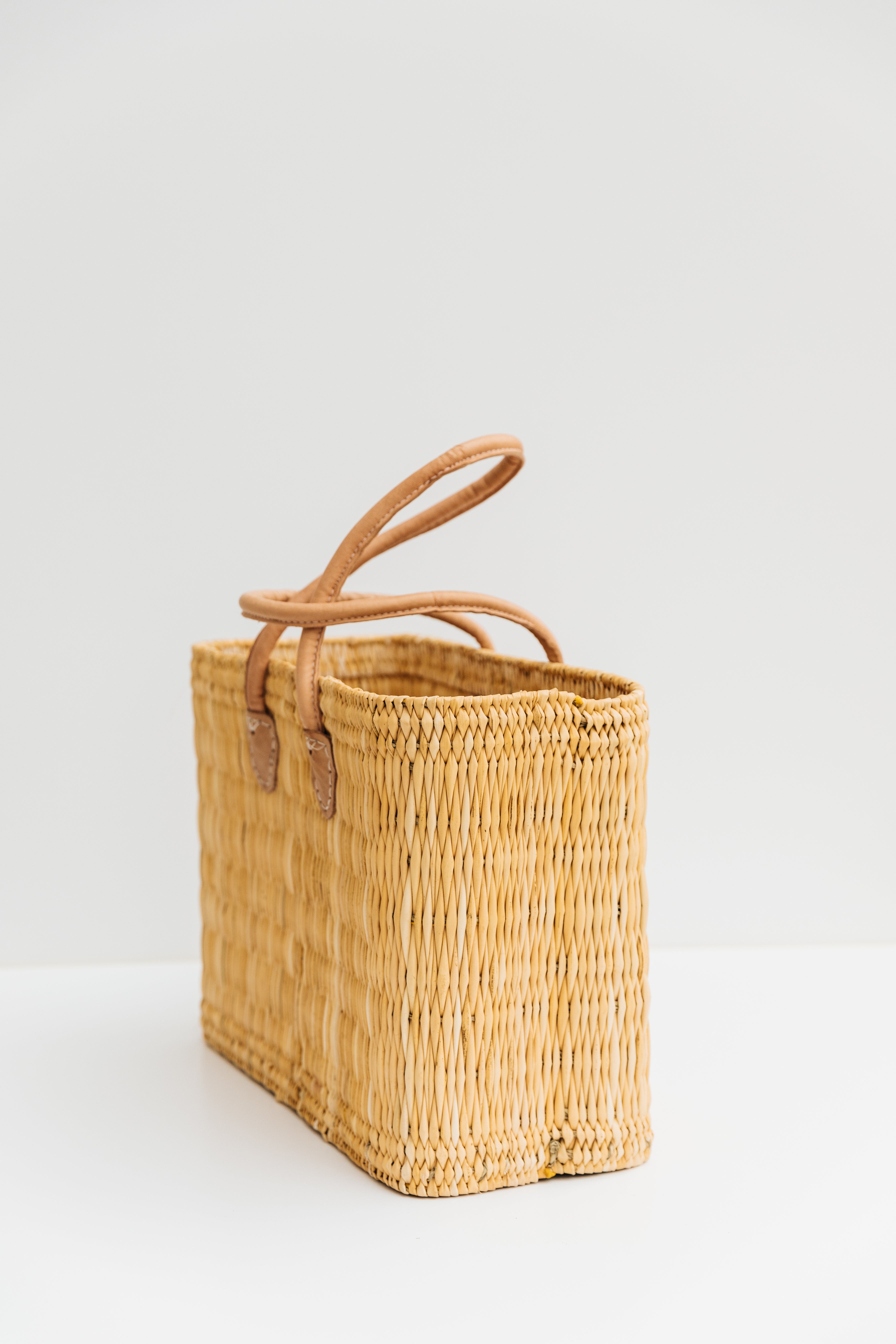 This Flat Weave Basket is made from Moroccan Reed, handwoven by experienced straw artisans. It's available in four sizes, from a compact purse size to a large beach basket size – all featuring beautiful leather handles for a luxurious feel. Enjoy the perfect combination of style and sophistication with this high quality basket.
