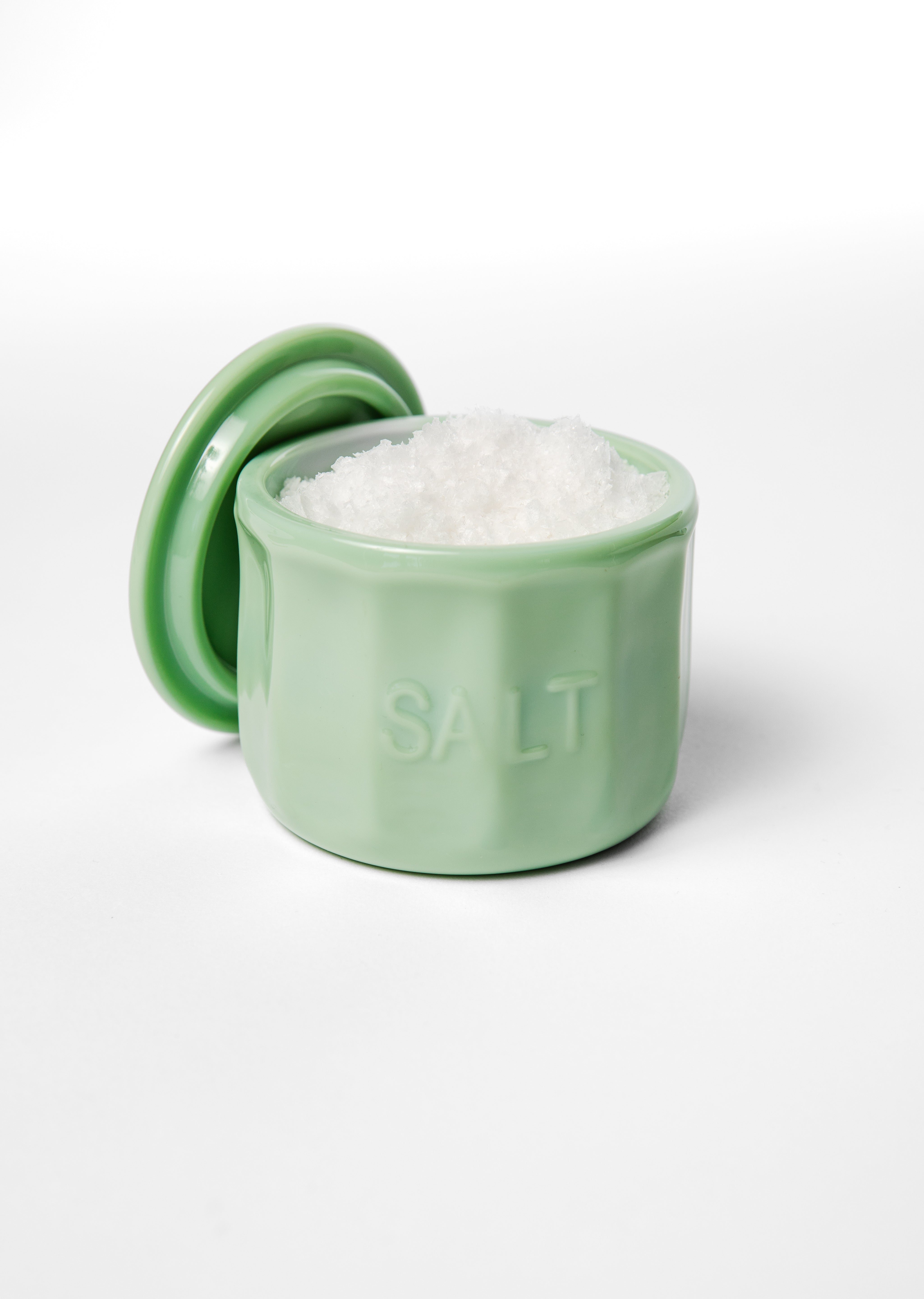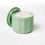 Elevate your dishes with this vintage-inspired salt cellar. Ideal for keeping your favorite seasoned salts close by for grilled fish or even avocado toast at breakfast, it features charming milky green glass. The embossed "Salt" label prevents mix-ups, while the 9oz capacity and removable lid make it easy to season your meals perfectly.