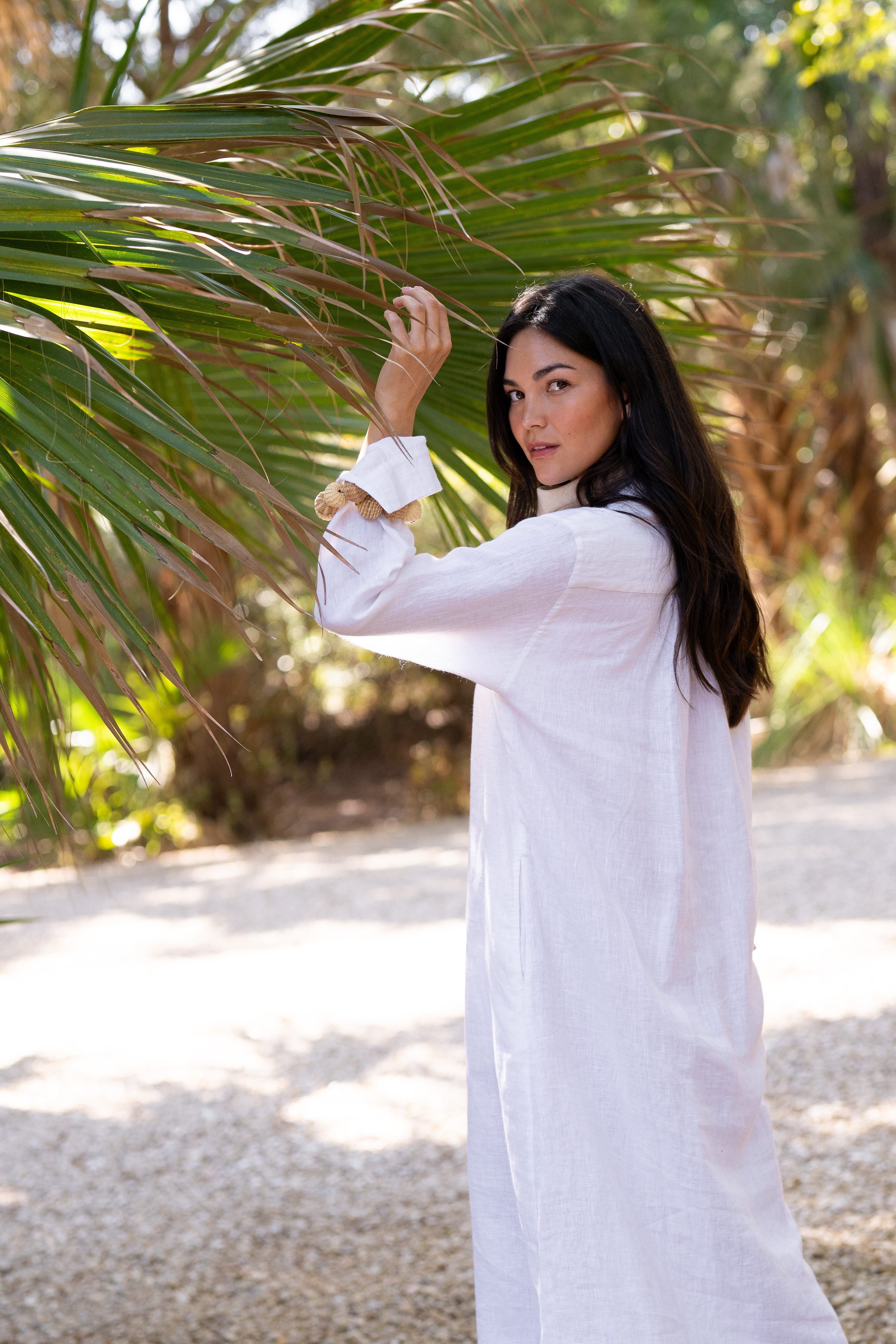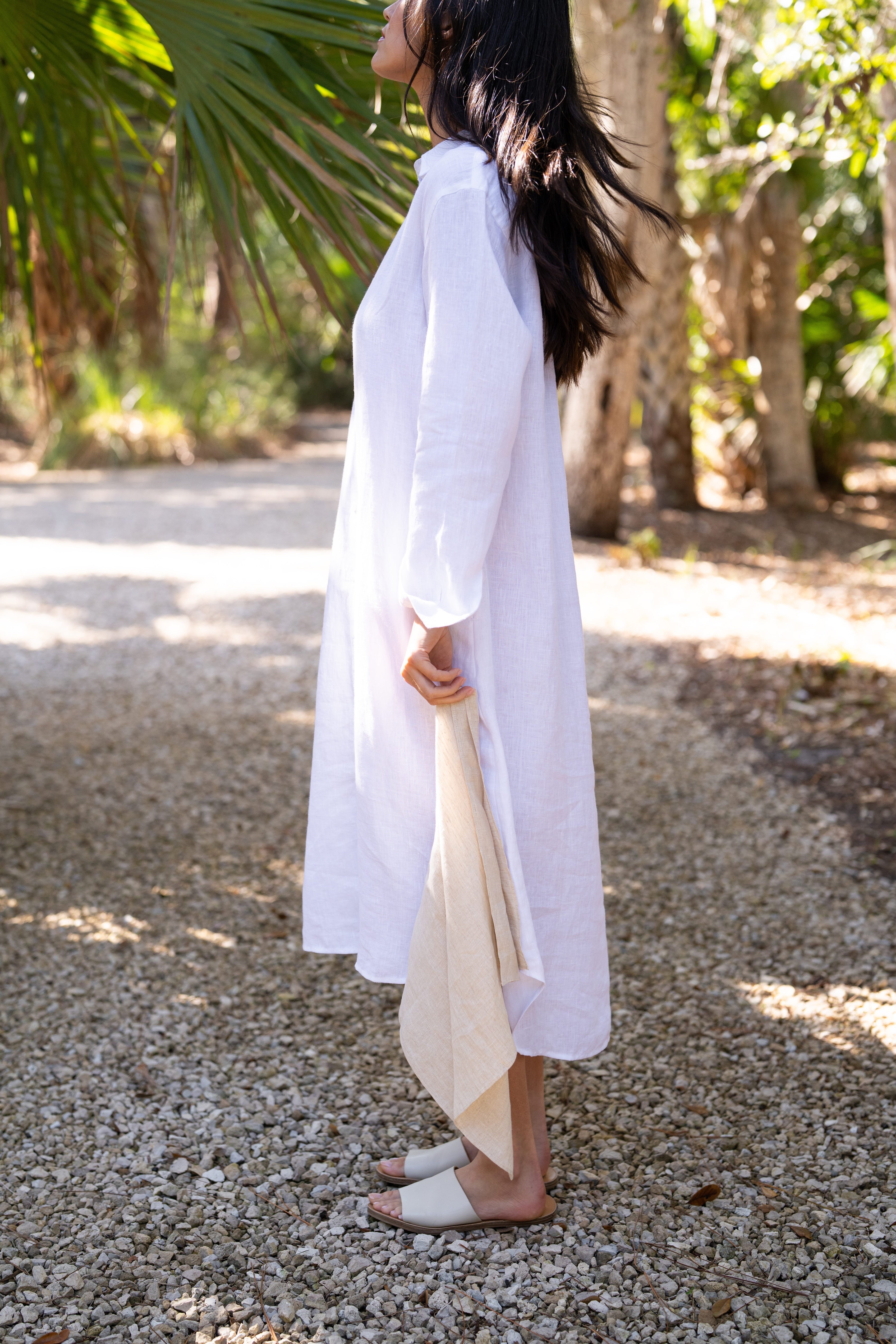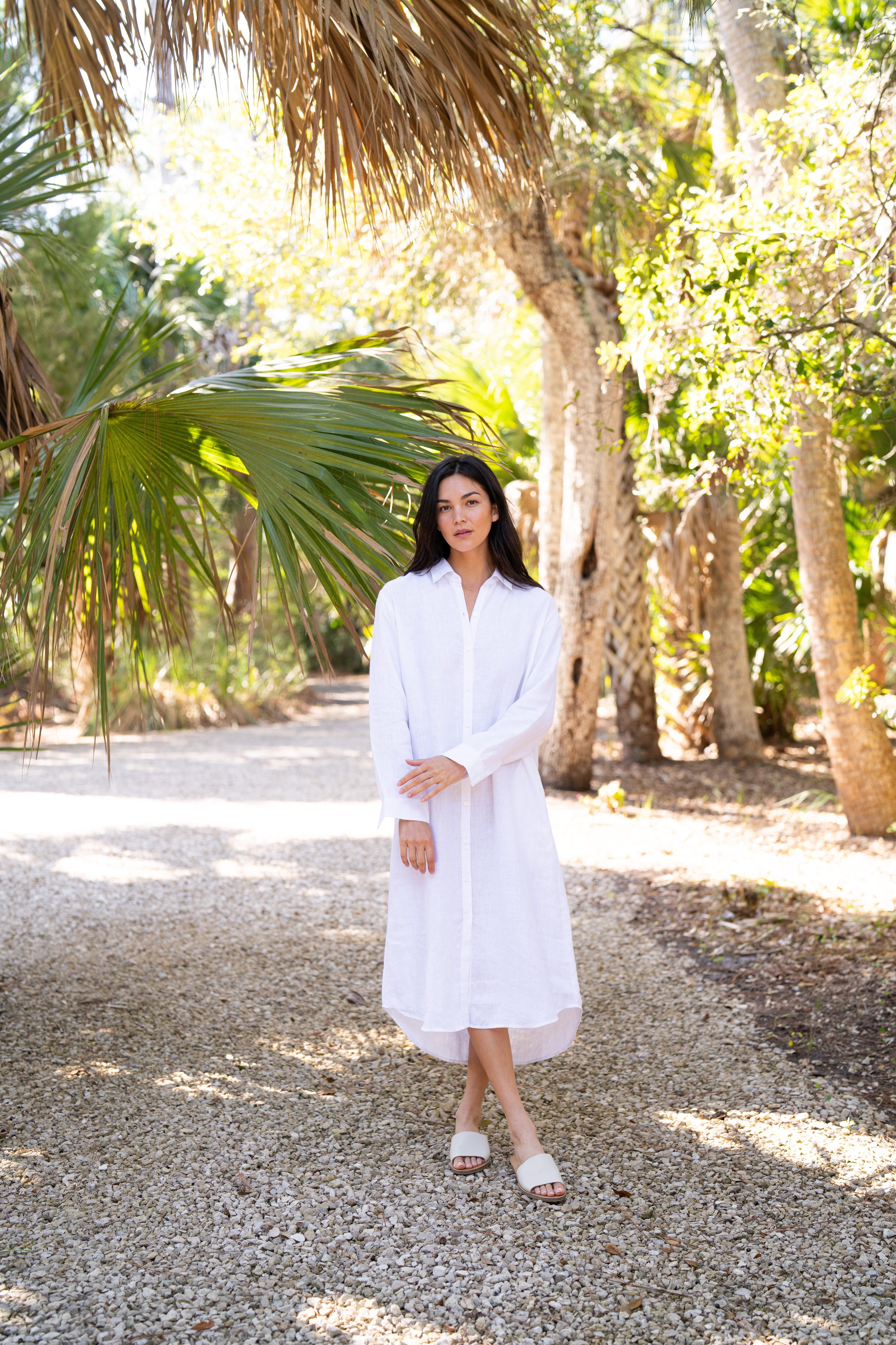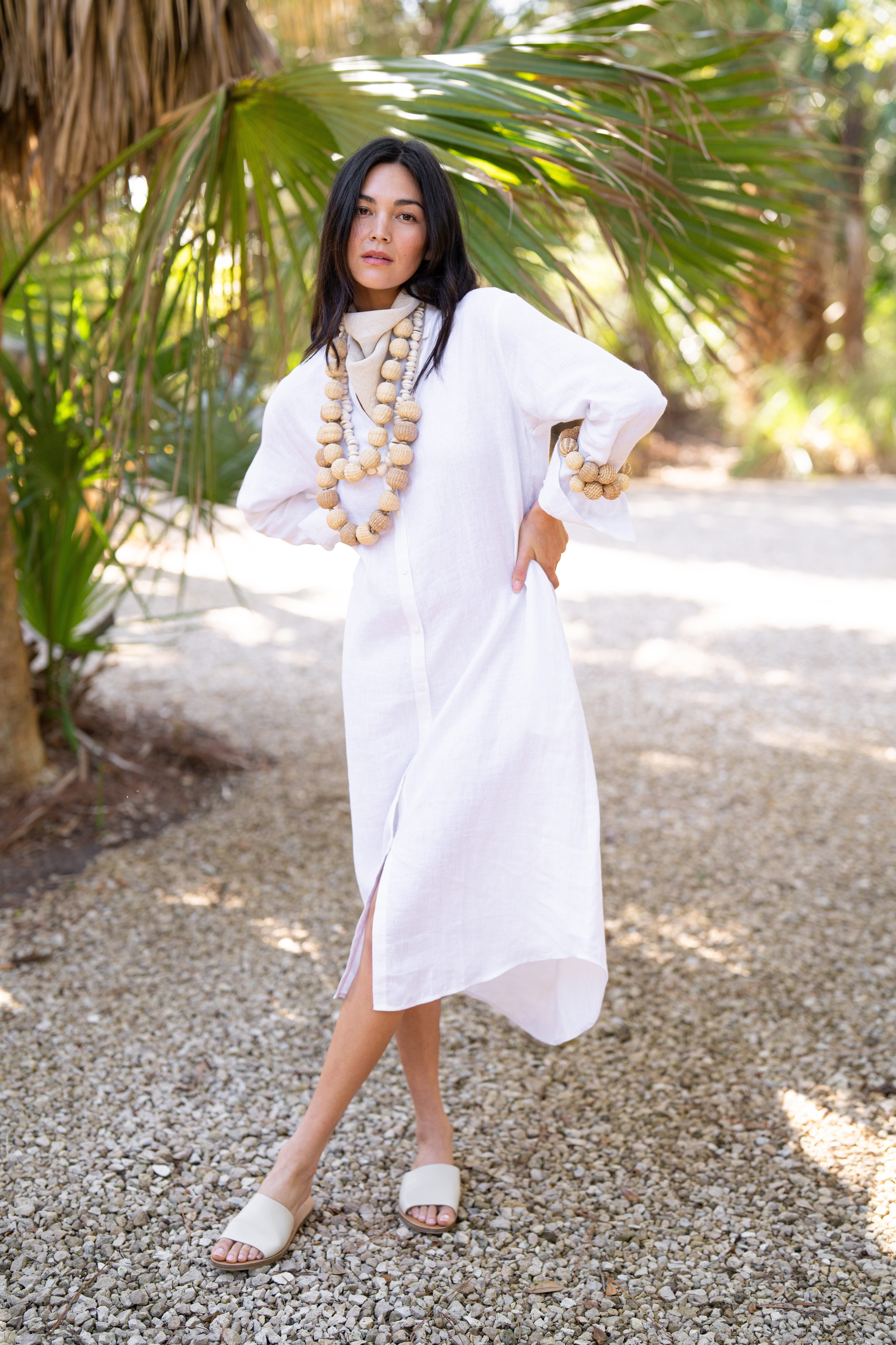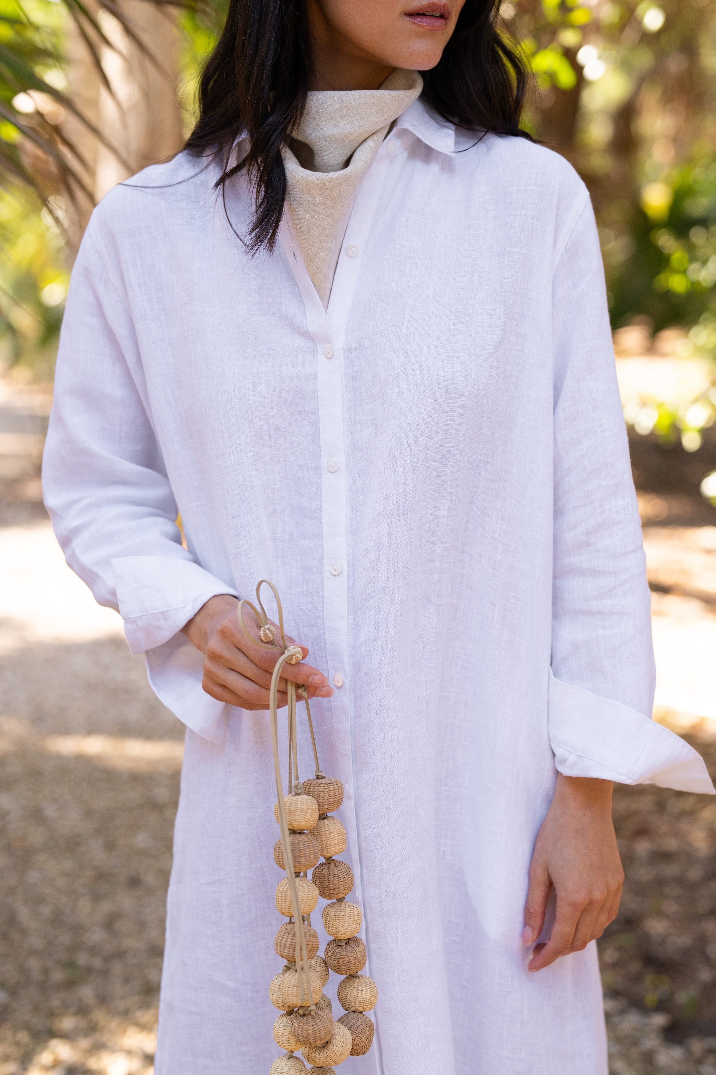 Our Linen Keepsake Dress in White is a dress version of our Keepsake Button Down. Designed with the same classic feel, breathable fabric, and timeless silhouette as the original shirt, it’s the kind of piece you’ll reach for again and again. Wear it on its own with sandals for a relaxed look or layer it with your favorite pieces to take it anywhere the day leads. Styled here with raffia jewelry and our linen bandana.
