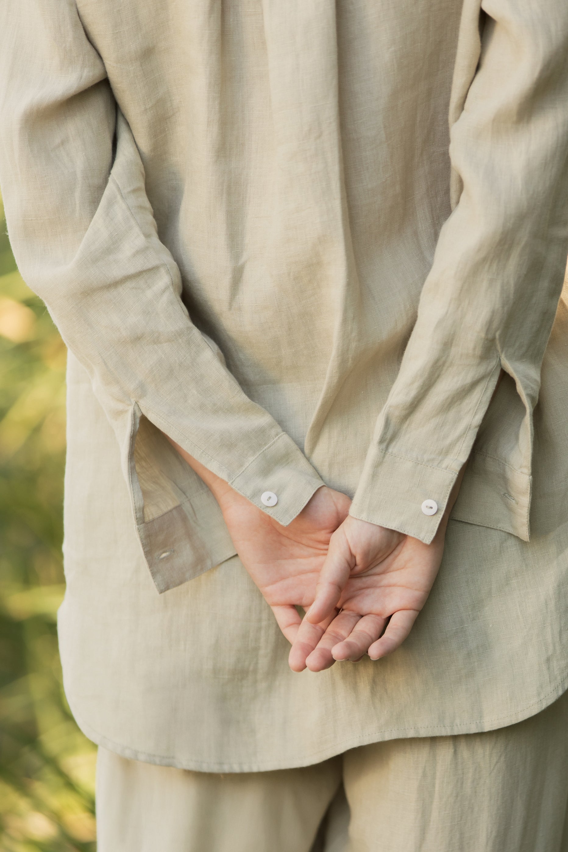 - Mother of Pearl buttons, shirting collar, and button sleeves