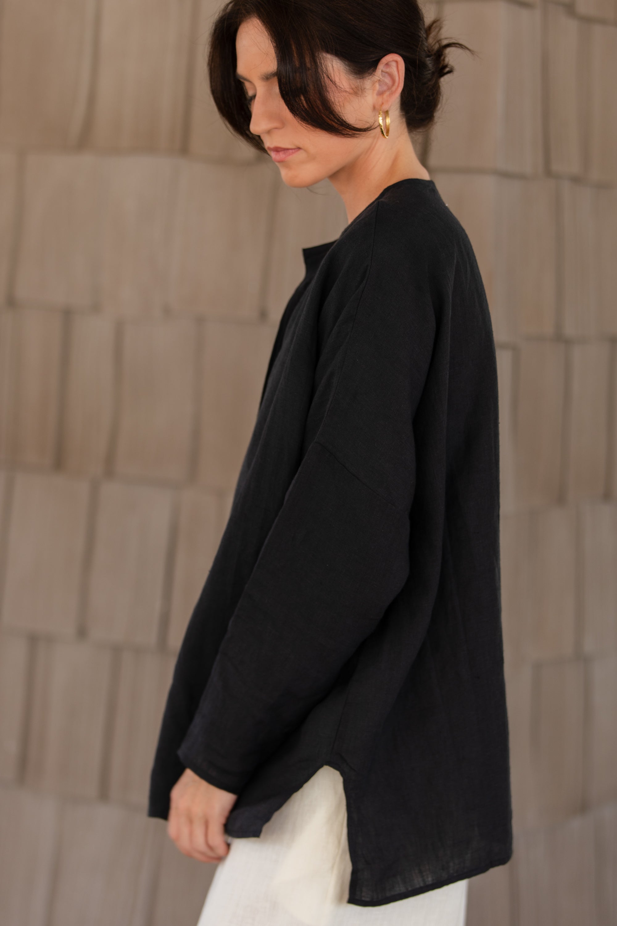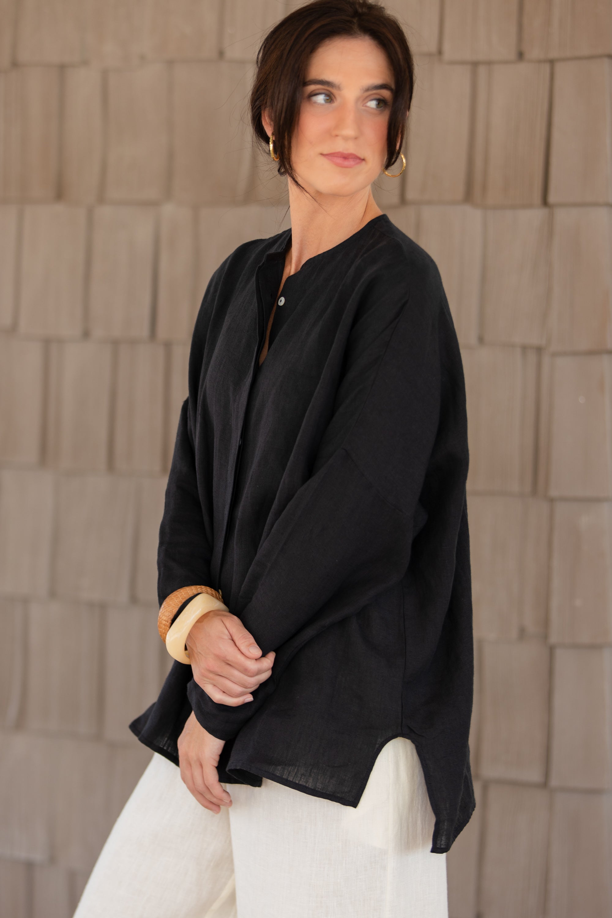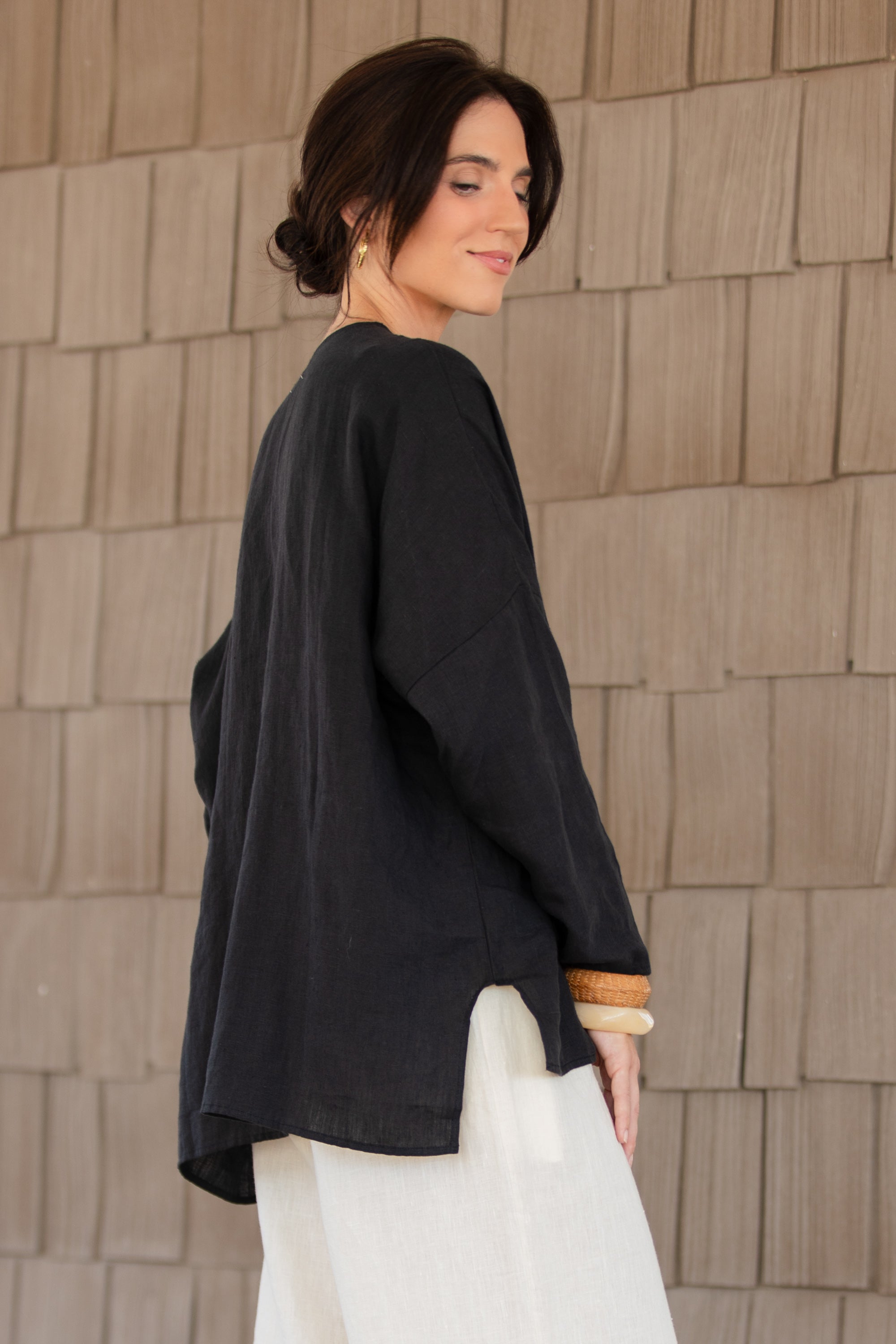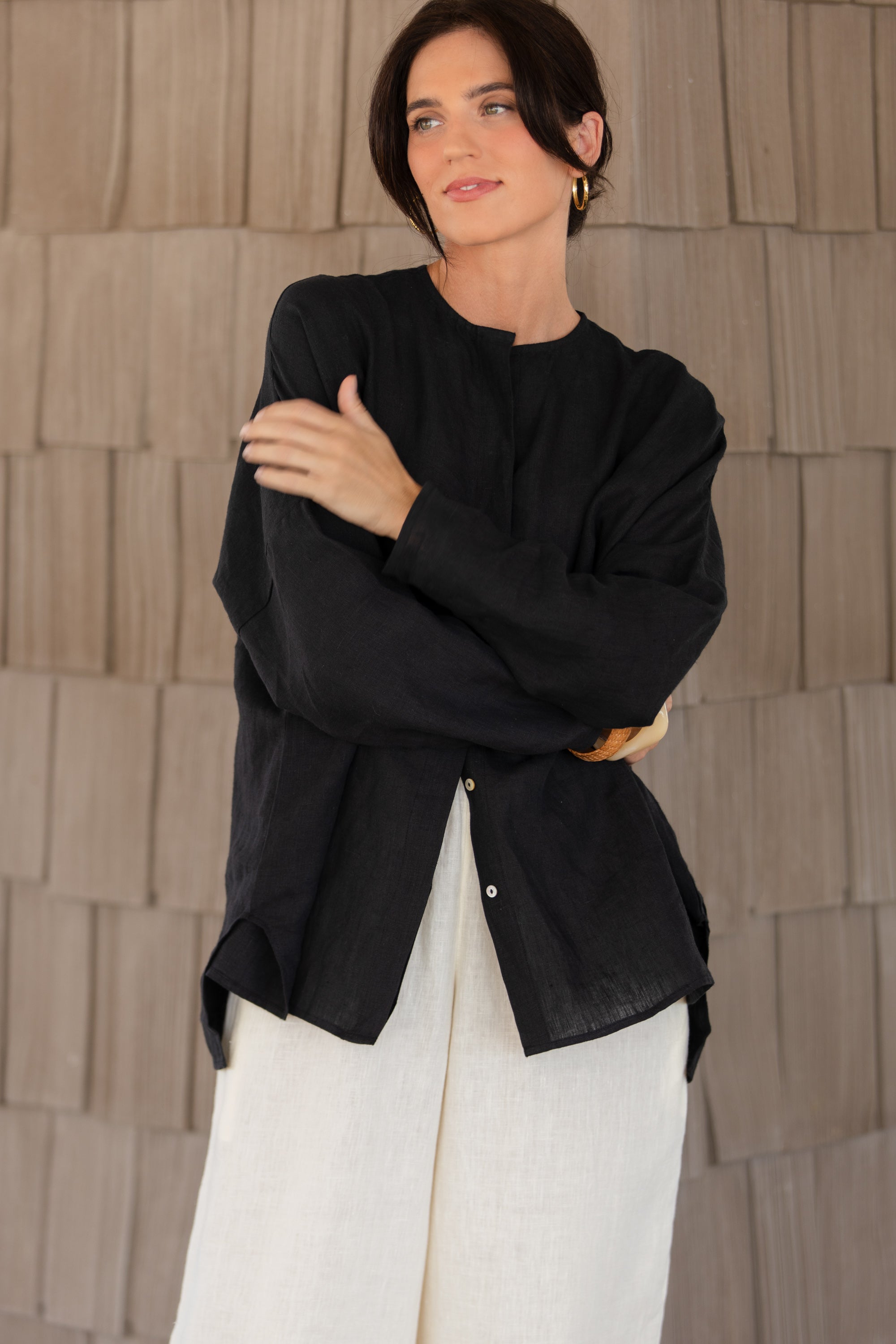 The Linen Sunset Shirt is a versatile piece perfect for any season, featuring a voluminous silhouette that pairs effortlessly with jeans, shorts, or as an open cardigan over a midi top. The extra-long sleeves can be rolled up for a stylish yet comfortable look.