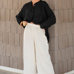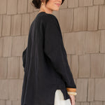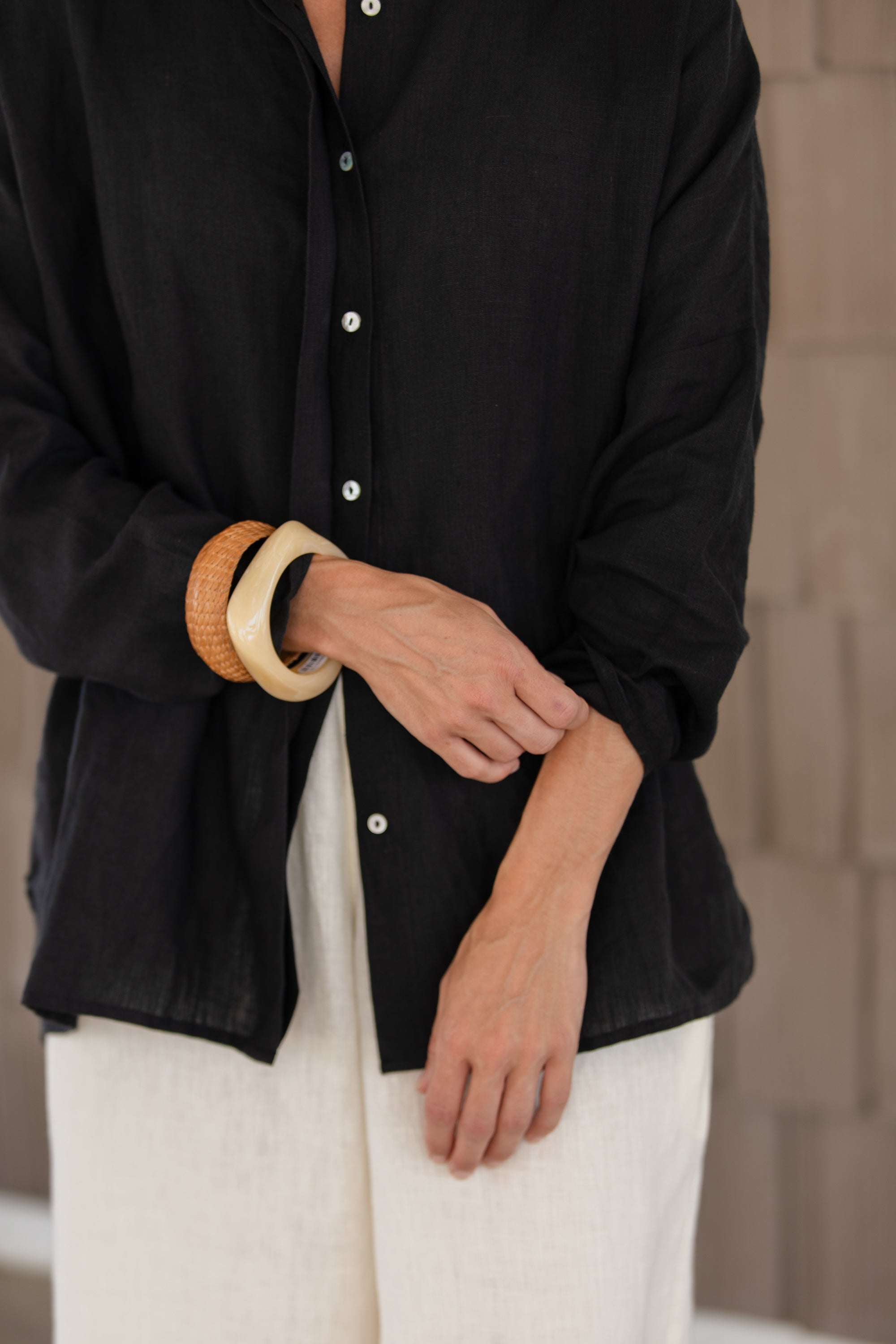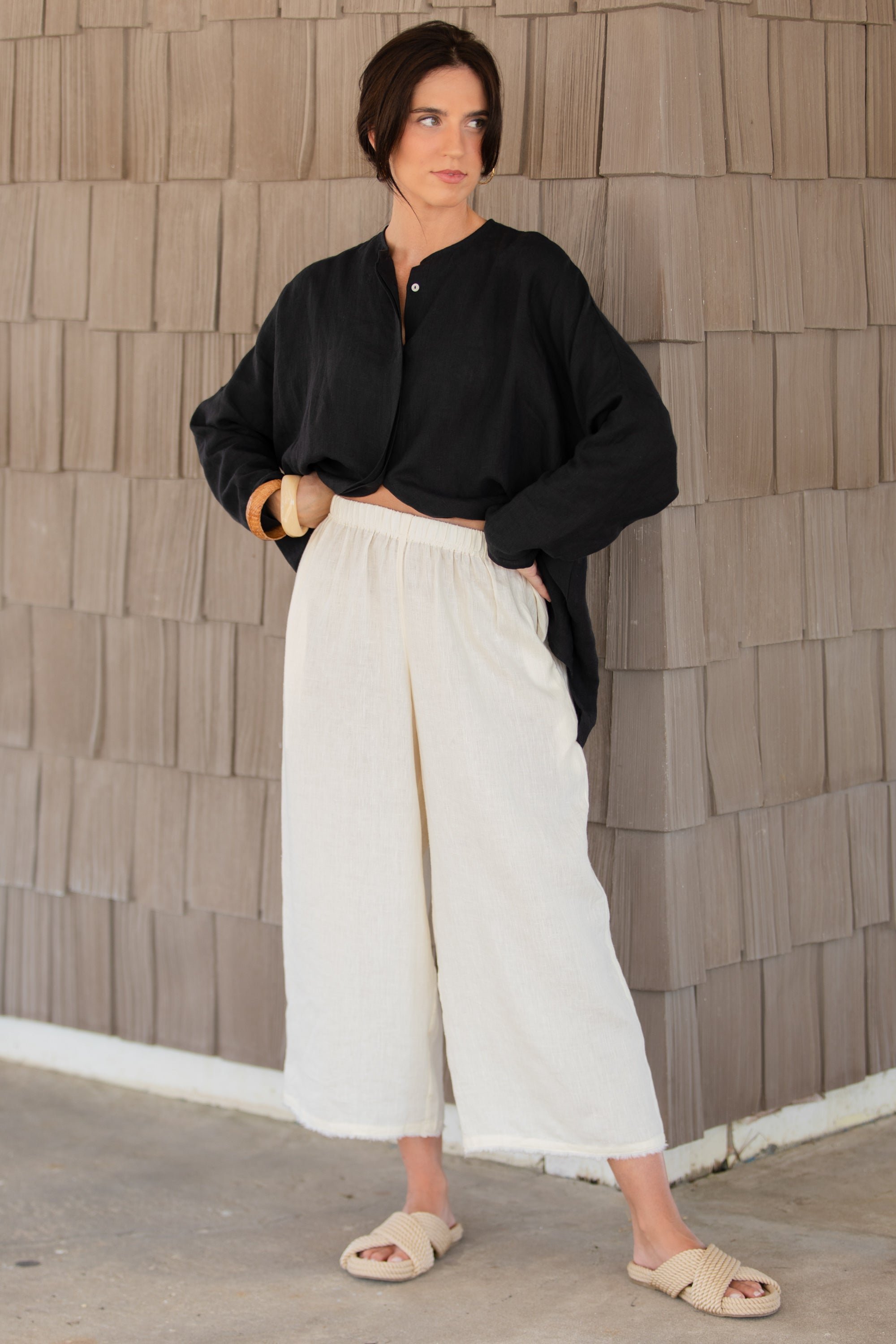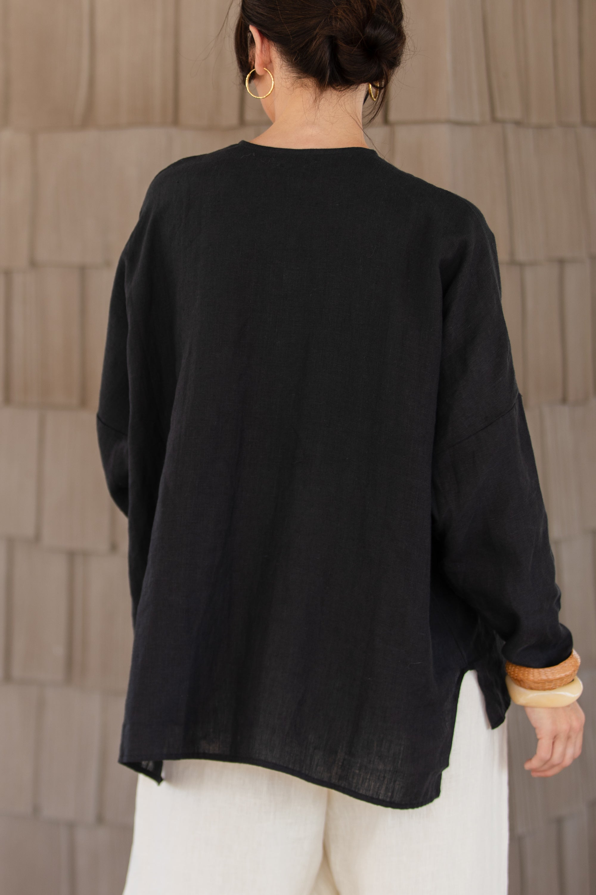 The Linen Sunset Shirt is a versatile piece perfect for any season, featuring a voluminous silhouette that pairs effortlessly with jeans, shorts, or as an open cardigan over a midi top. The extra-long sleeves can be rolled up for a stylish yet comfortable look.