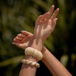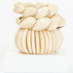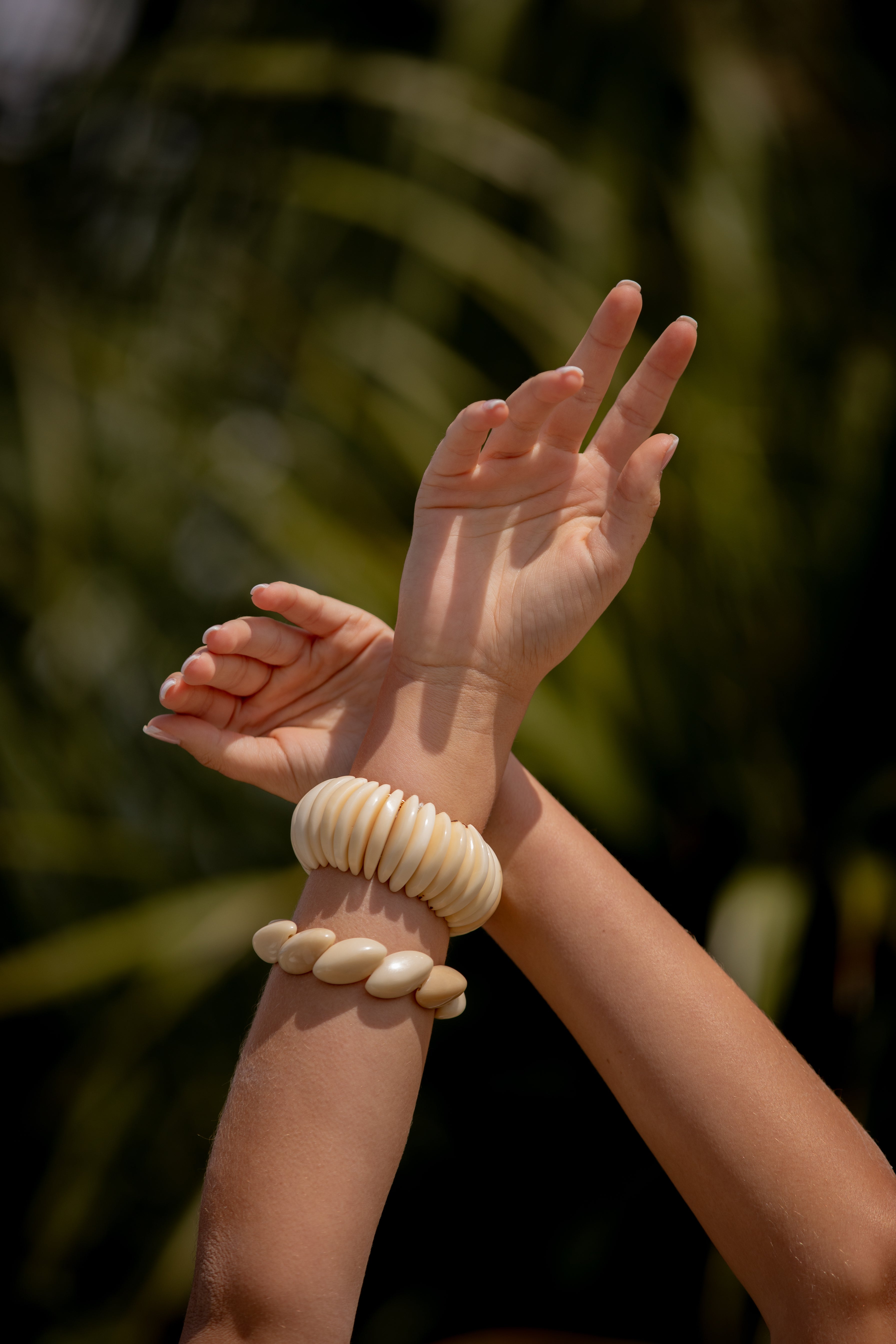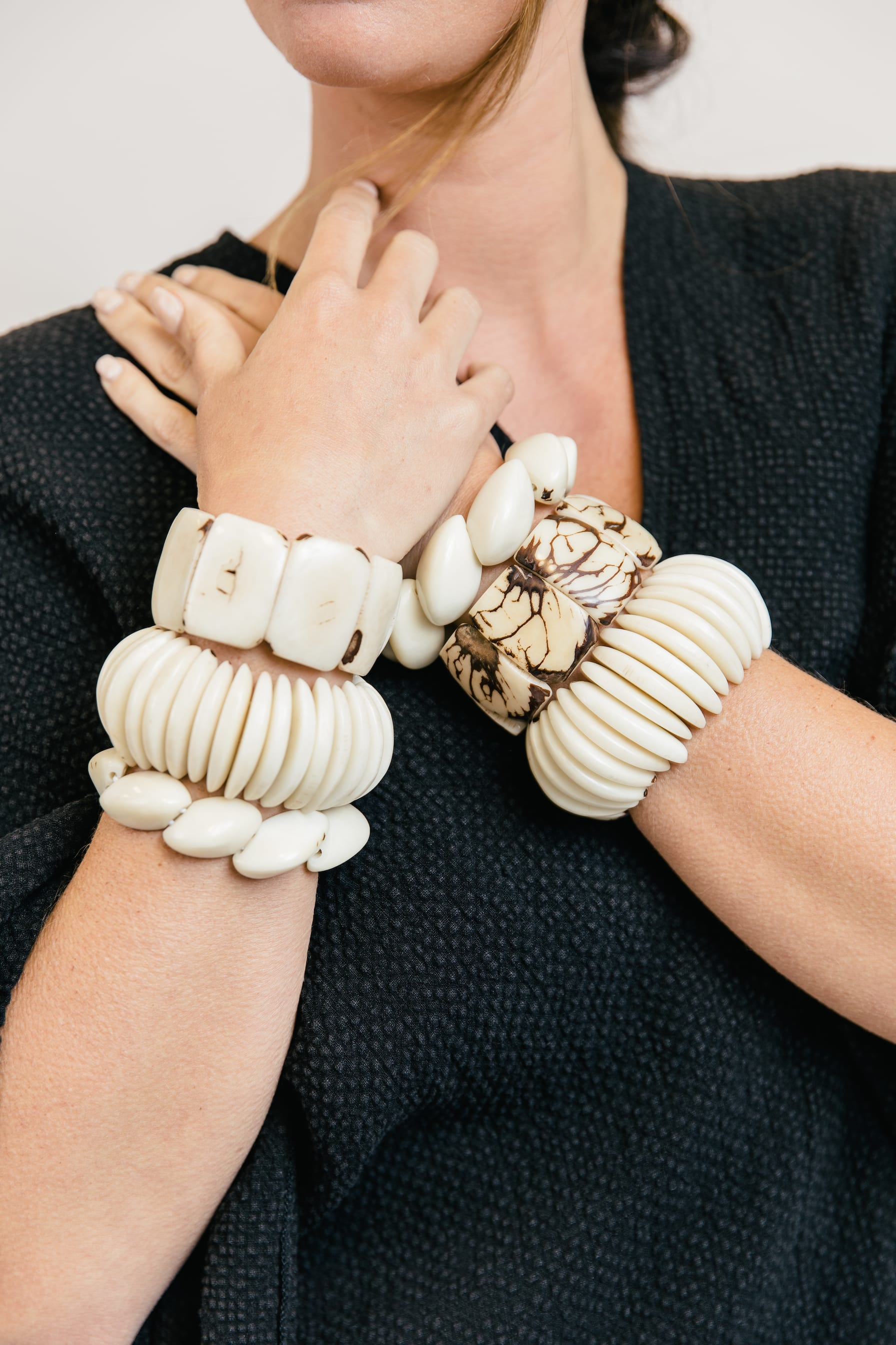 Our Palm Ivory Bracelets, are made of a renewable plant product from the Tagua Palm -- similar to a coconut -- and give the look of real bone and ivory jewelry without the amoral heartache. Crafted on white stretch cords, our bracelets are comfortable and easy to pack. You can pair our Palm Ivory jewelry with white linens, a caftan, and leather sandals for a classic, sharp look.