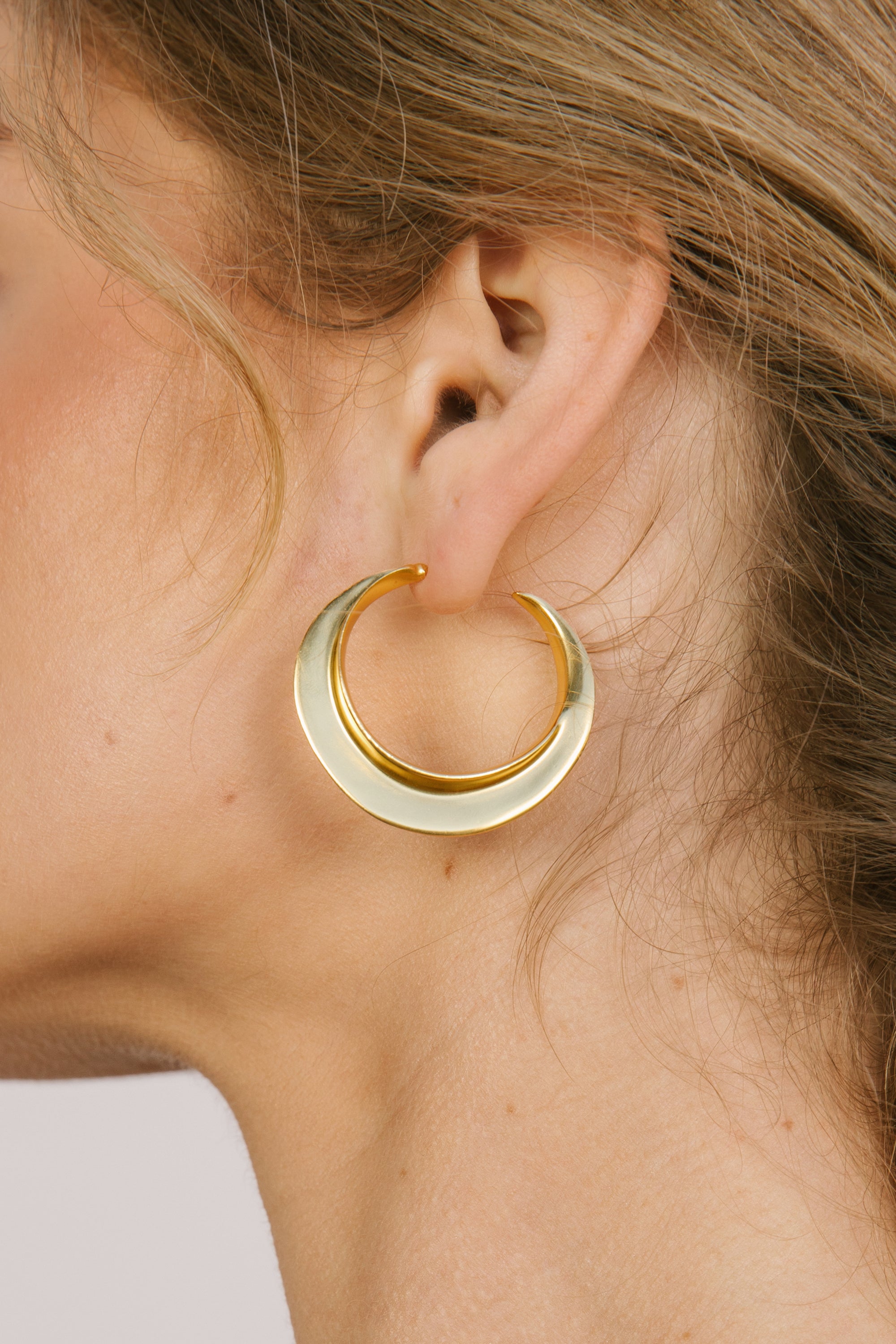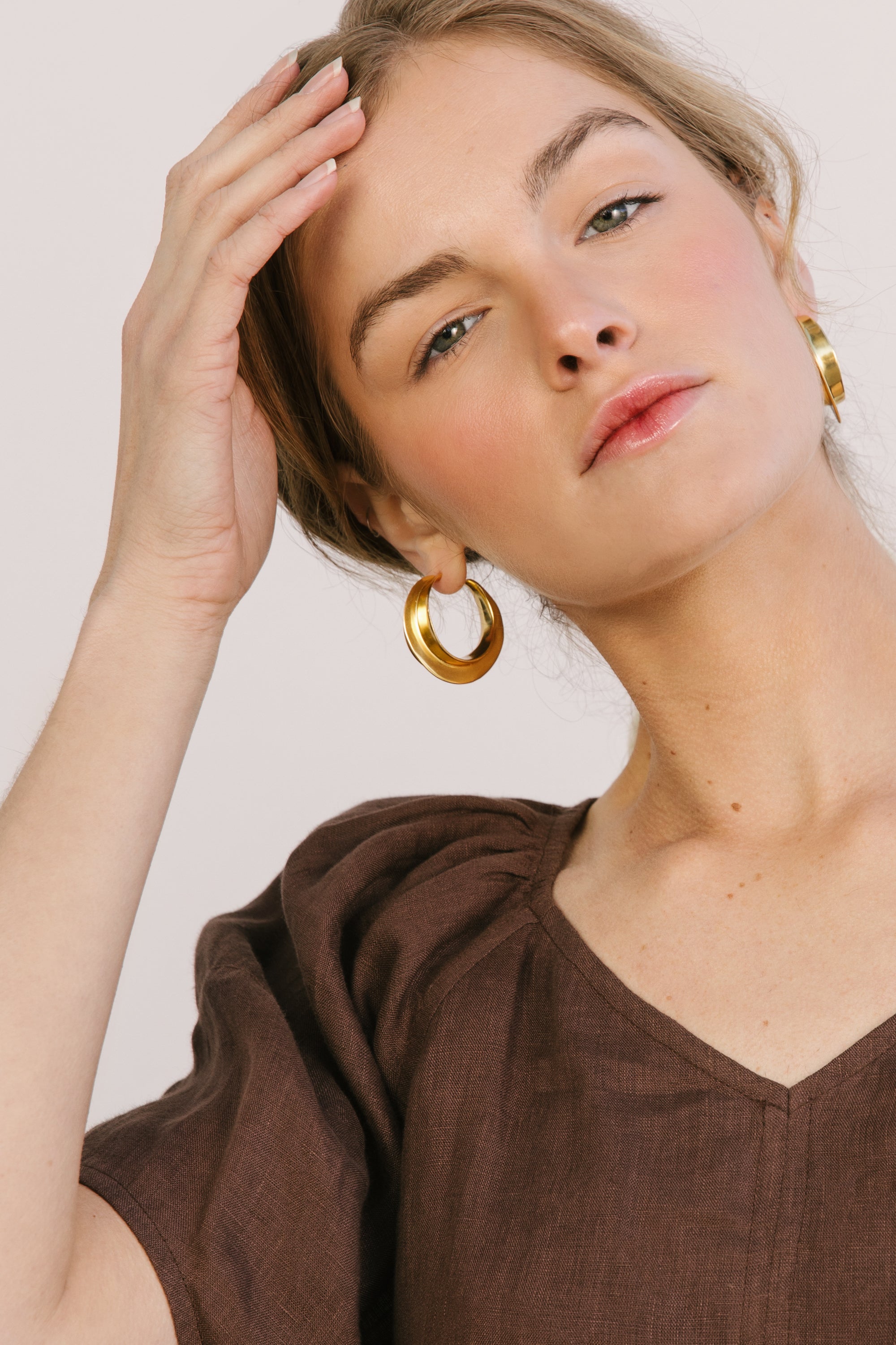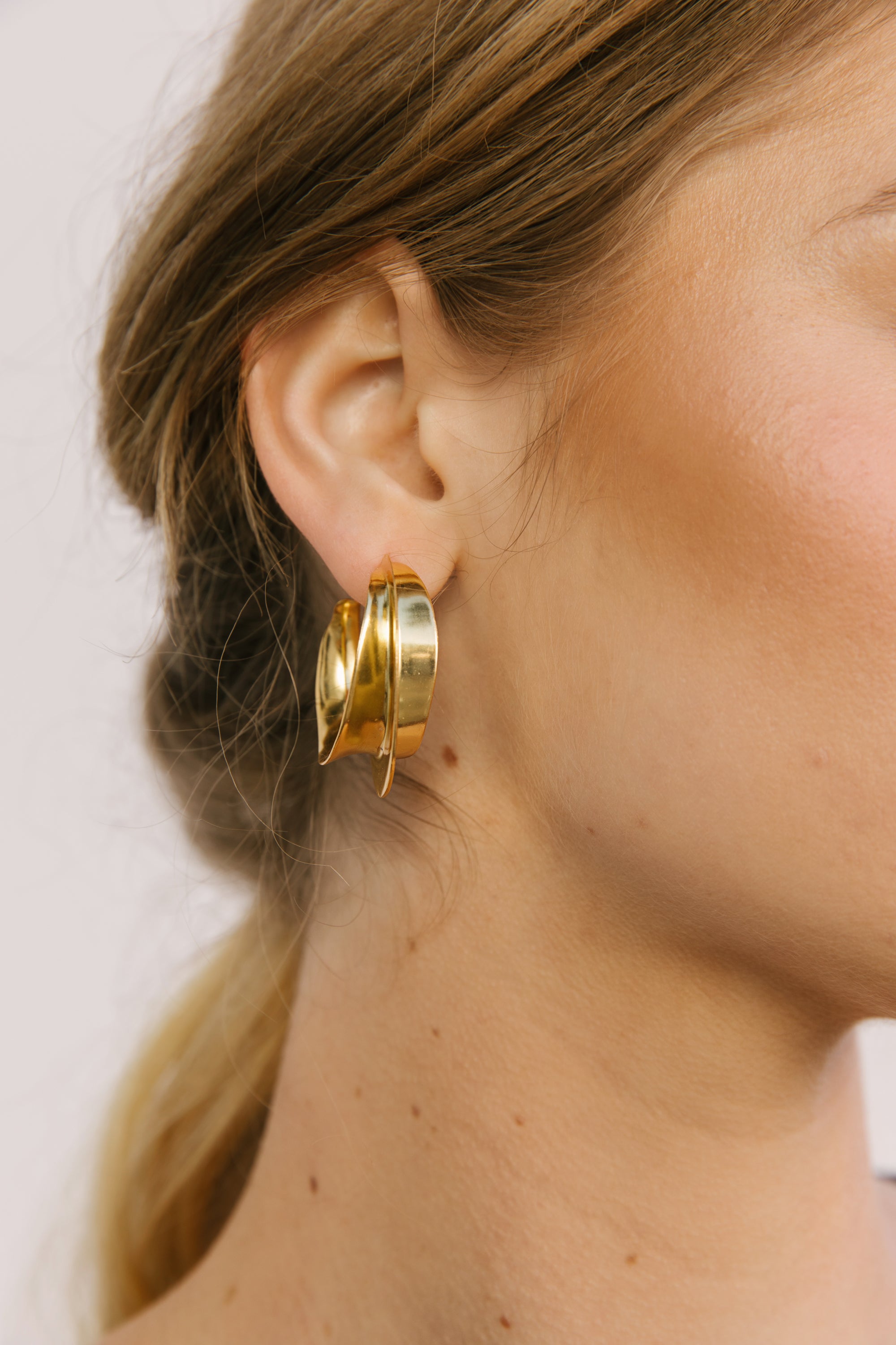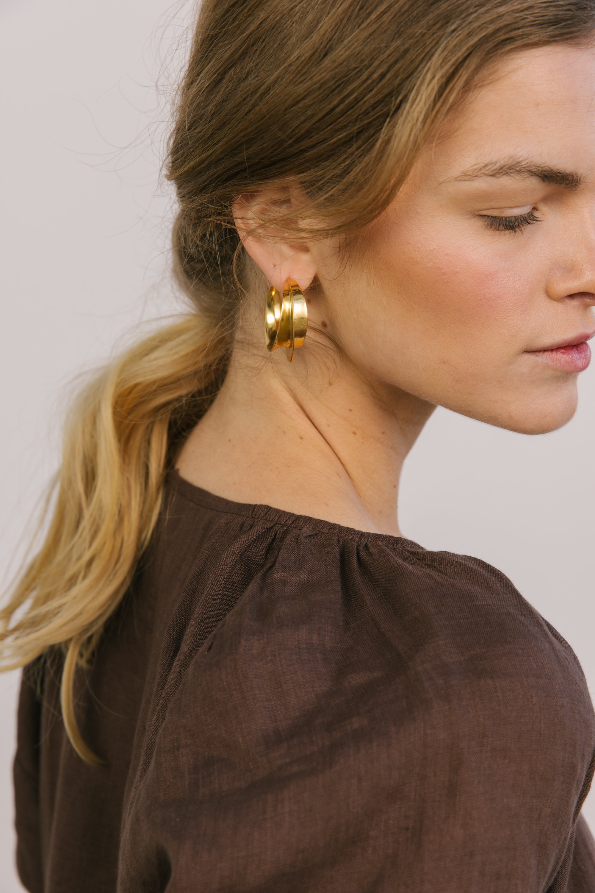 Our Solstice Hoops feature a bold, curved silhouette with just the right amount of movement. Lightweight and easy to wear, they catch the light beautifully and add a face-framing finish that feels both polished and effortless.