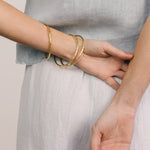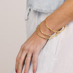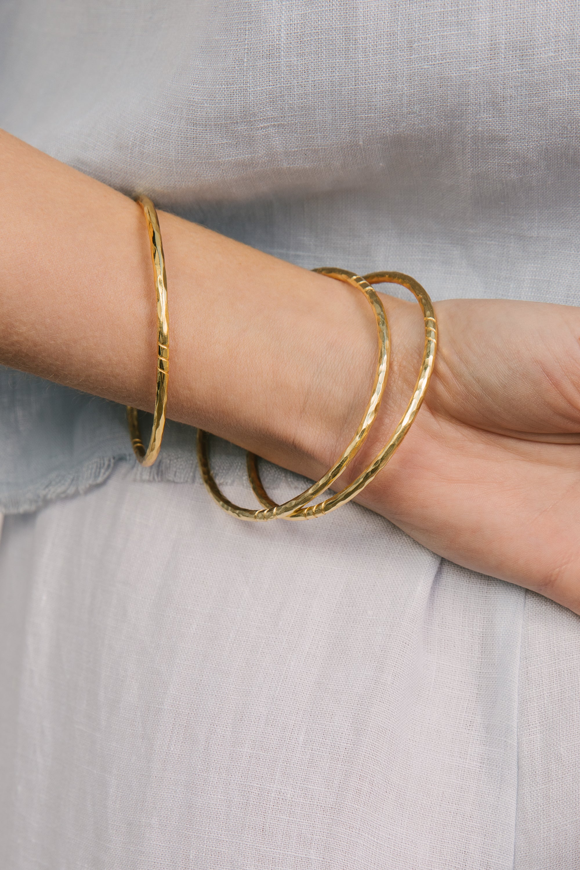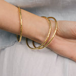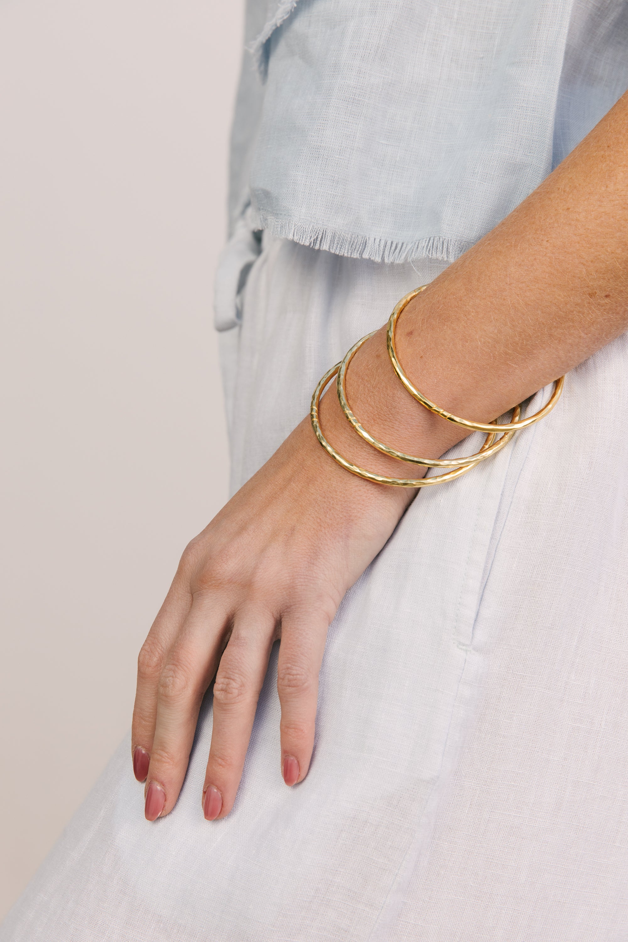 The Trio Bangle Set brings a warm glow to your everyday style with three coordinating gold-plated bangles. Their wide, hammered design offers an effortlessly stacked look that’s both elegant and easy to wear—perfect for dressing up or keeping it casual.